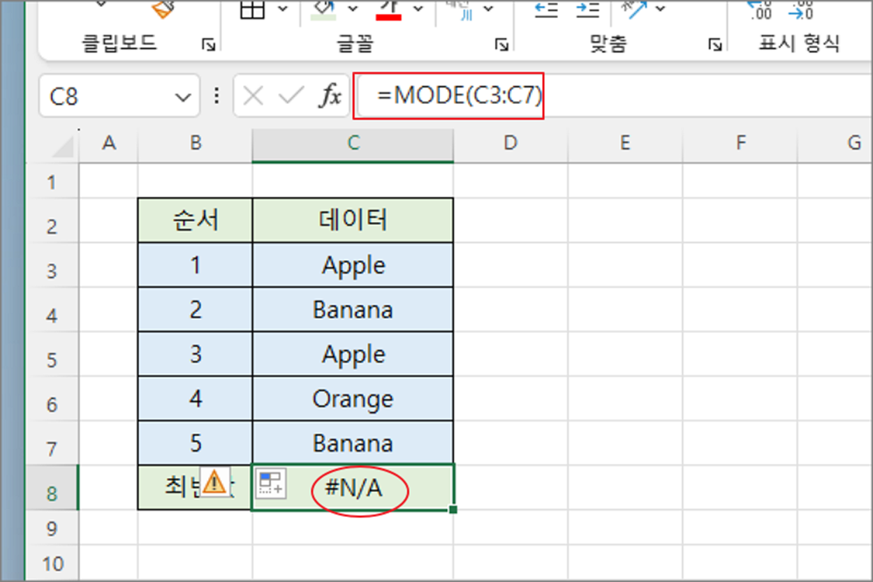 ▼ 그림처럼 문자열 영역에서 MODE 를 사용하면 #N/A 오류가 발생합니다. 우리가 원하는 정상적인 값을 찾을 수가 없습니다.