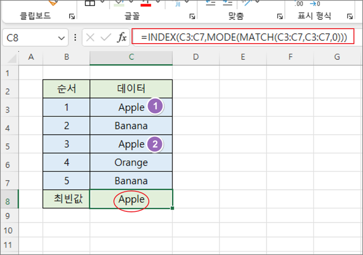 ▼ 이제 반환값 1을 이용해서 해당 위치의 텍스트를 가져와야 합니다. 여기에 사용한 함수는 INDEX() 입니다. “INDEX” 함수는 주어진 범위에서 특정 위치에 있는 값을 반환합니다. 여기서는 최빈값의 위치를 사용하여 원래 데이터 범위 “C3:C7”에서 해당 값을 찾습니다. 따라서 이 수식은 열 C 에서 가장 많이 나타나는 값을 찾아 해당 값을 반환합니다. 그것이 바로 Apple 입니다.