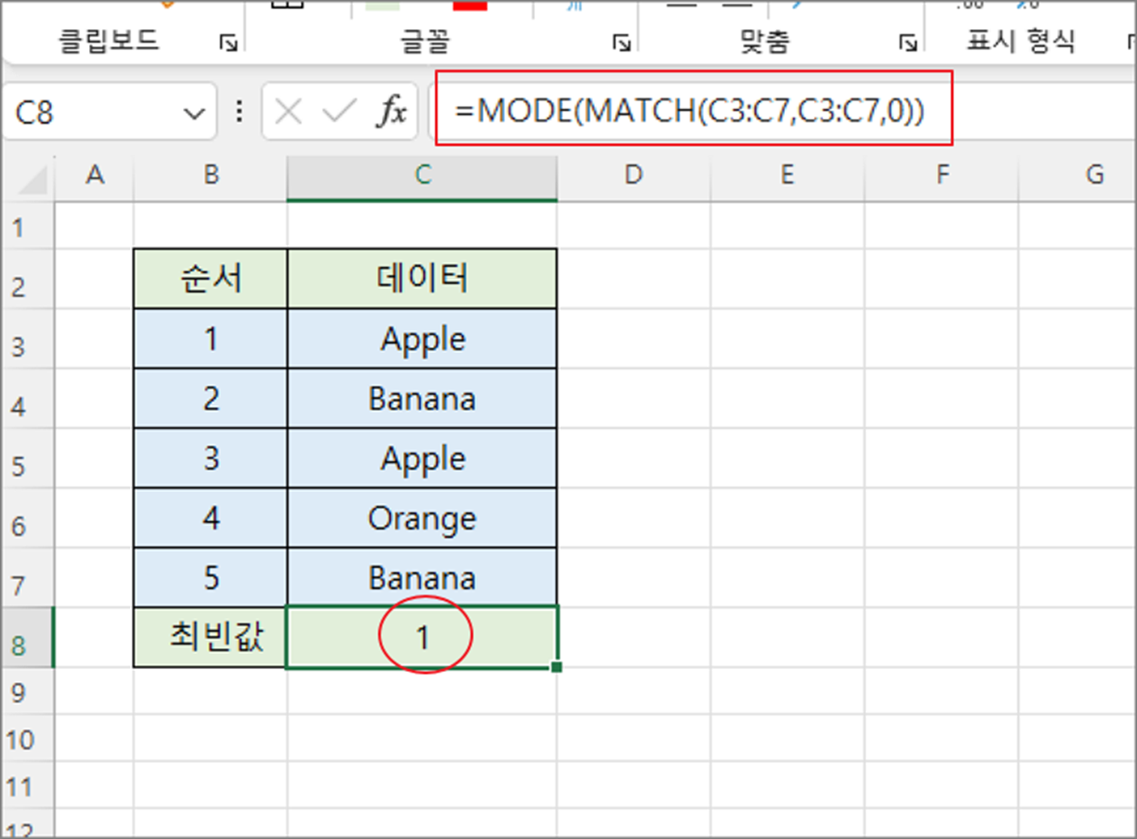 ▼ MATCH 함수를 이용해서 추출한 숫자를 이용해서 MODE(...) 함수로 최빈값을 계산합니다. 여기서는 “MATCH” 함수의 결과인 배열을 사용하여 최빈값을 찾습니다. 결과는 1과 2 중 작은 값인 1 을 반환했습니다.