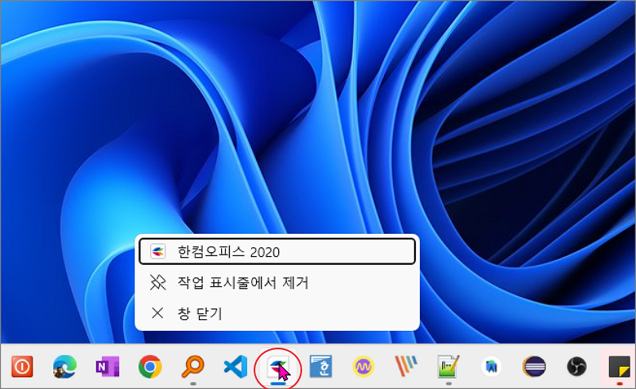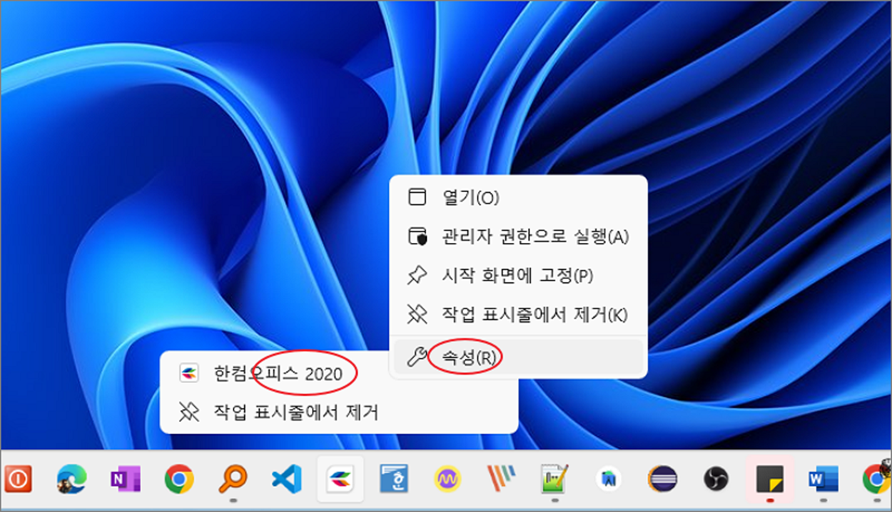 ▼ 예를 들어서 작업 표시줄에 추가한 바로가기 아이콘에서 프로그램의 위치를 찾아보겠습니다. 제가 가지고 있는 프로그램 중 한글이 있습니다. 한컴오피스가 실제가 어디에 설치되어 있는지 확인해 보겠습니다. 한컴오피스 아이콘에서 오른쪽 마우스를 클릭하고 화면에 뜬 메뉴에서 다시 한컴오피스 메뉴에 오른쪽 마우스를 클릭합니다.