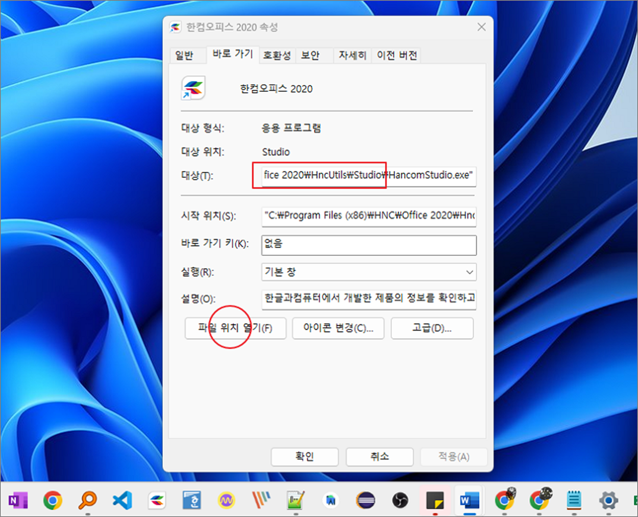 ▼ 한컴오피스 속성창에서 "바로 가기" 탭으로 이동하면 "대상" 이라는 항목이 있습니다. "대상" 안에 위치가 폴더 주소입니다. 화면 아래에 "파일 위치 열기" 를 클릭하면 바로 이동할 수 있습니다.