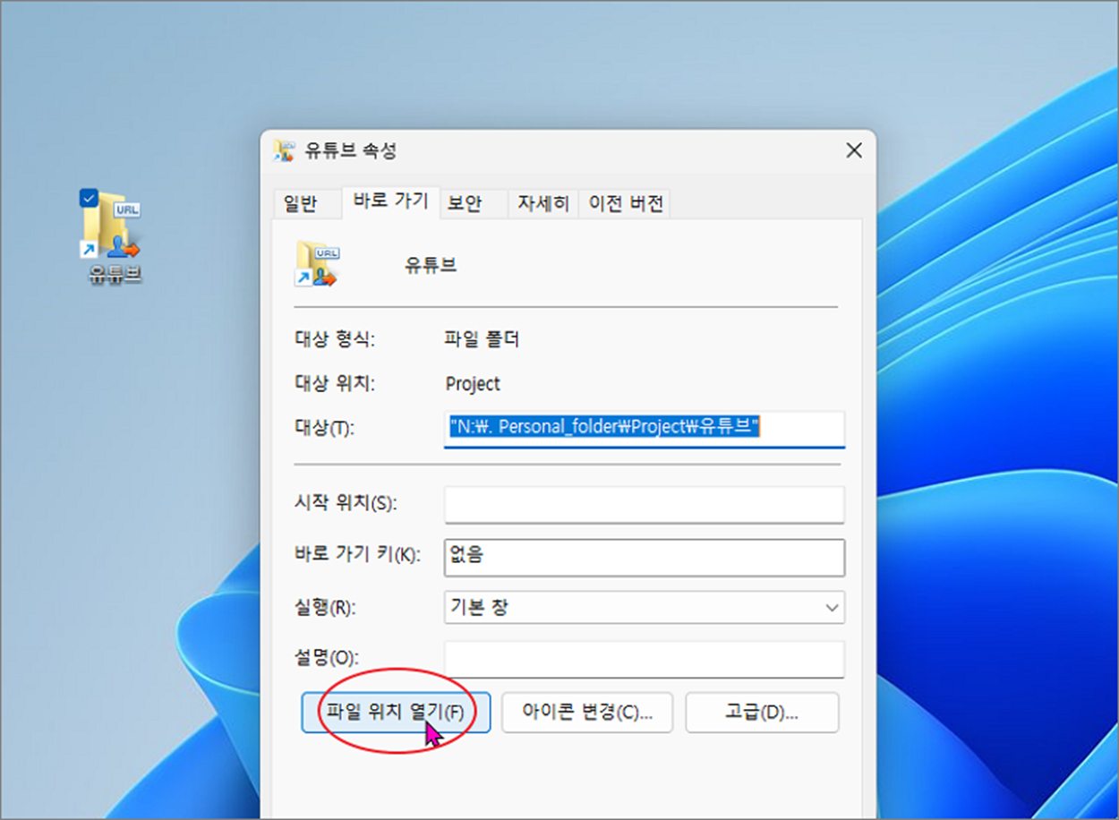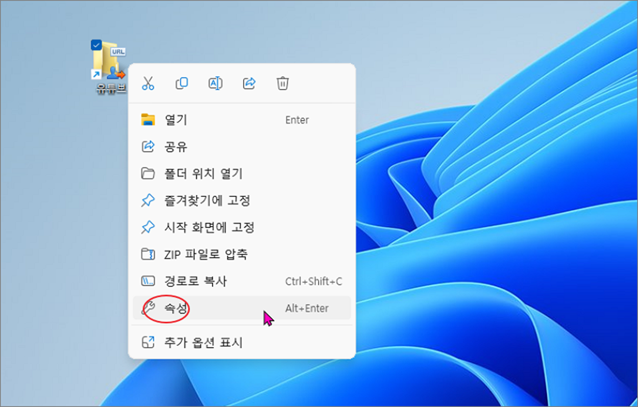 ▼ 프로그램 외에도 사용자가 만든 바로 가기 아이콘의 폴더도 이동할 수 있습니다. 바로가기 아이콘을 선택하고 오른쪽 마우스 클릭합니다. 그리고 "속성" 메뉴를 선택합니다.