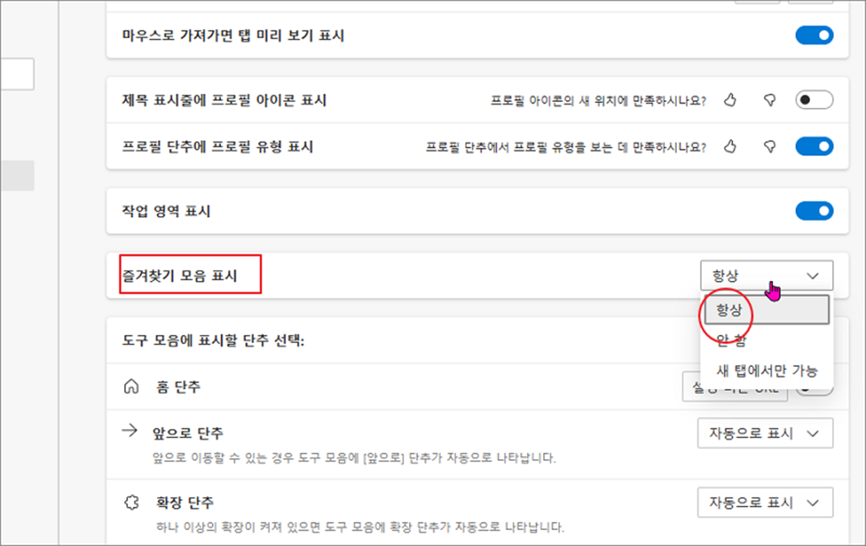 ▼ "즐겨찾기 모음 표시" 에는 3가지 메뉴가 있는데, "표시 안함" 에서 "항상" 으로 변경합니다.