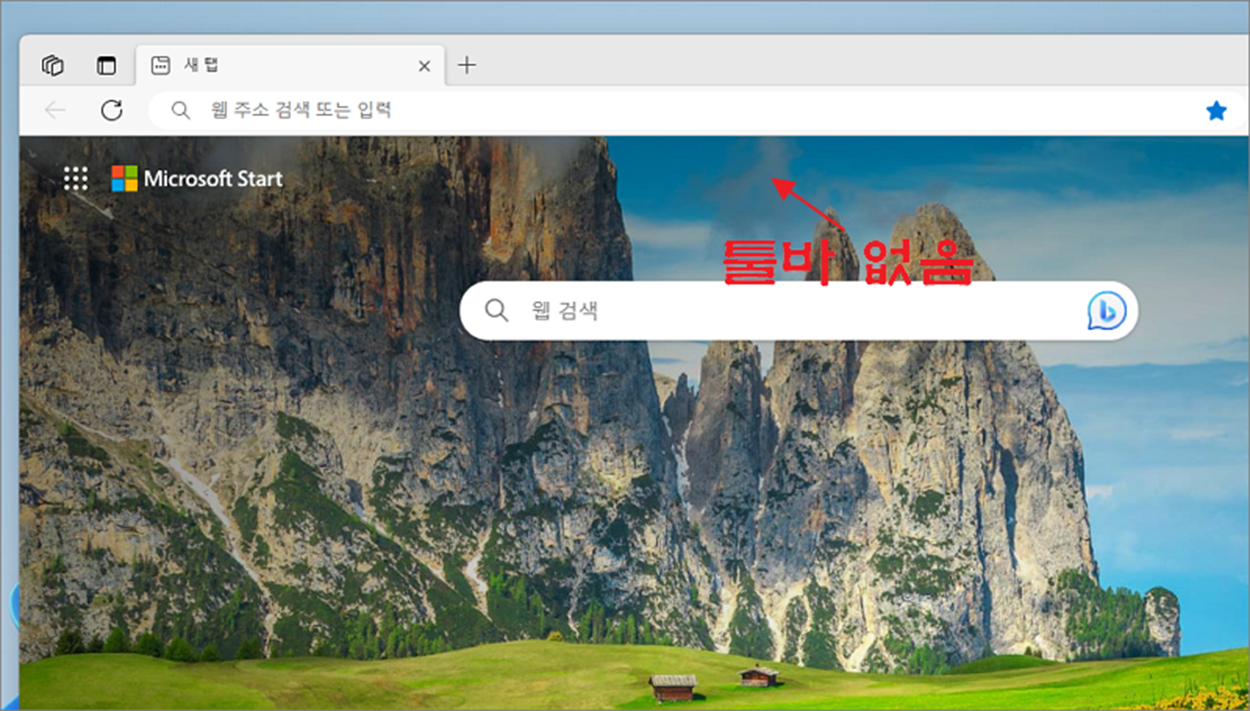 ▼ 먼저 엣지 브라우저를 띄워 보세요. 현재는 즐겨찾기 툴바가 화면에 나타나 있지 않습니다. 새 탭을 눌러도 즐겨찾기는 보이지 않습니다. 그럼 즐겨찾기 툴바를 화면에 표시해 보겠습니다.