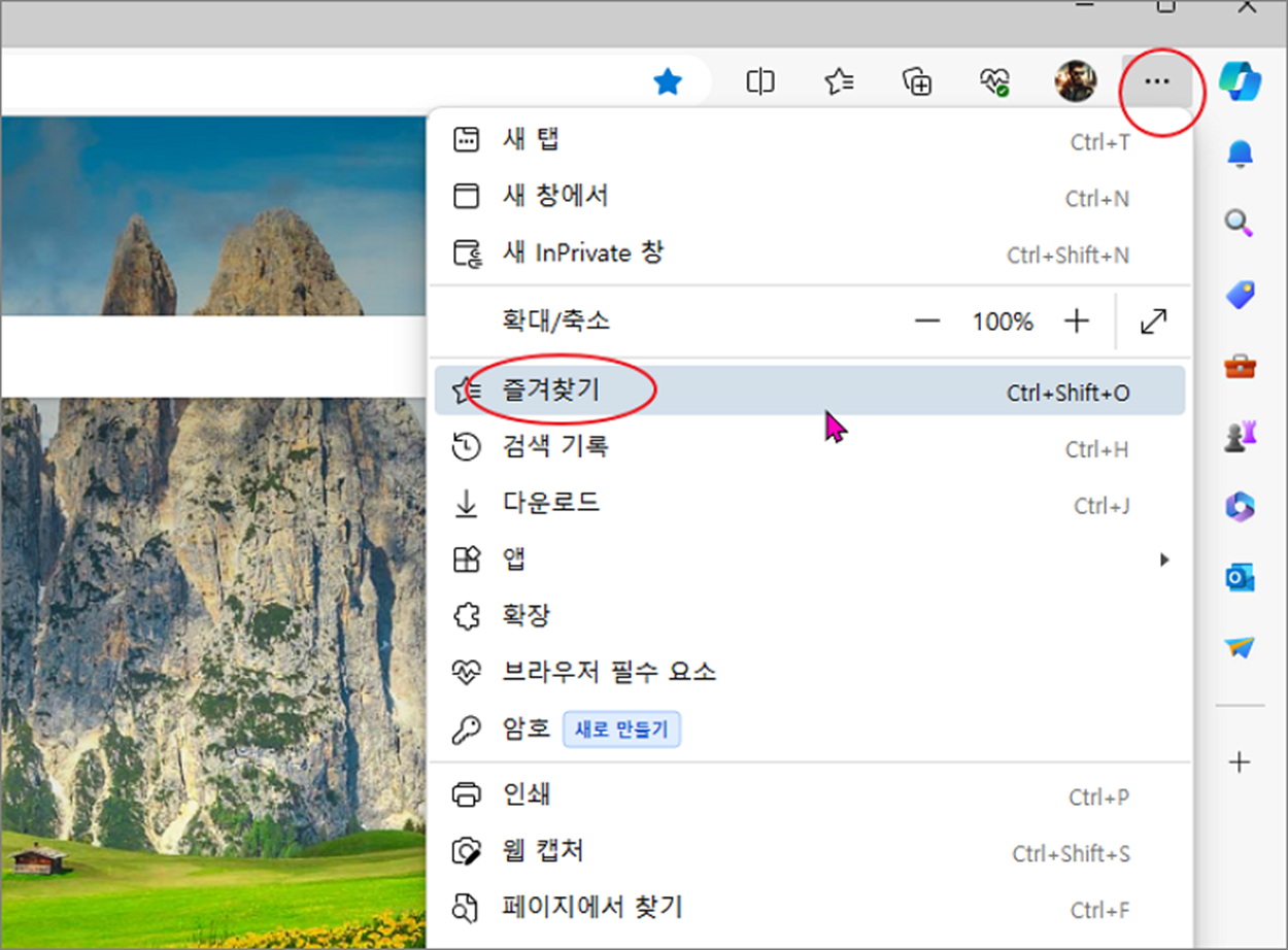 ▼ 오른쪽 상단 더보기 버튼을 눌러 하위 메뉴를 띄우고 "즐겨찾기" 메뉴를 클릭합니다.