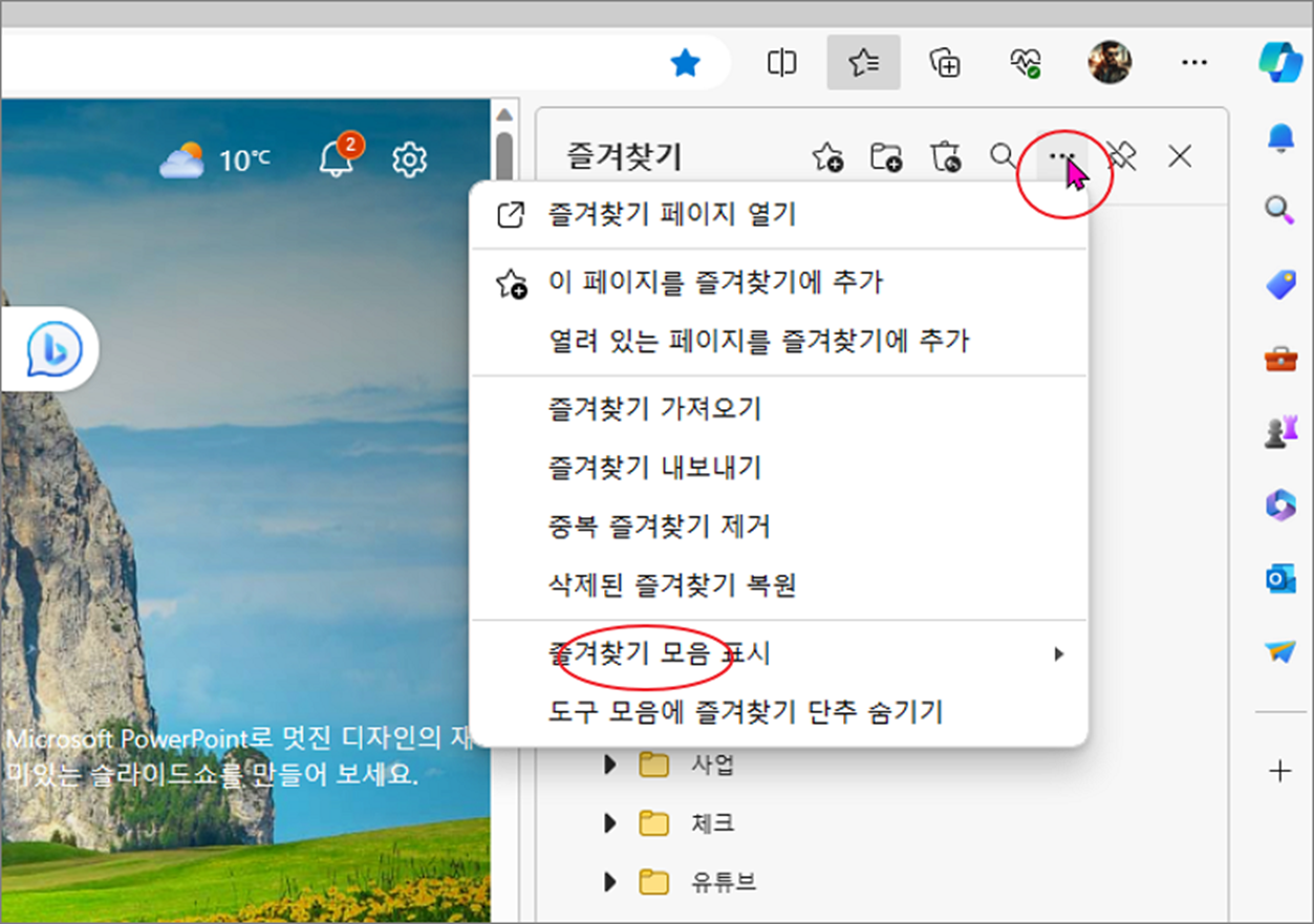 ▼ 즐겨찾기 화면 상단 더보기 메뉴를 클릭하고 하위에 "즐겨찾기 모음 표시" 로 갑니다.