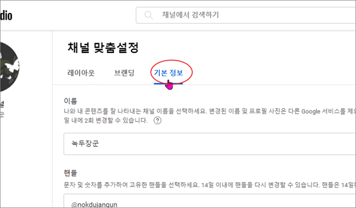 ▼ 채널 맞춤 설정에서 "기본 정보" 탭으로 이동합니다. 이곳에서 "설명" 과 "링크추가", "연락처 정보" 를 수정할 것입니다.
