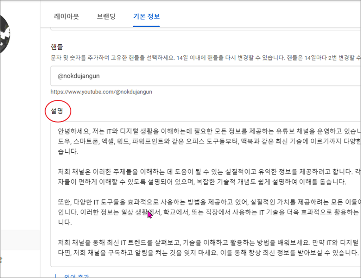 ▼ "설명" 란은 채널을 소개하는 곳입니다. 1000 자 이하로 입력해야 합니다. 저는 미리 준비한 내용을 입력했습니다.