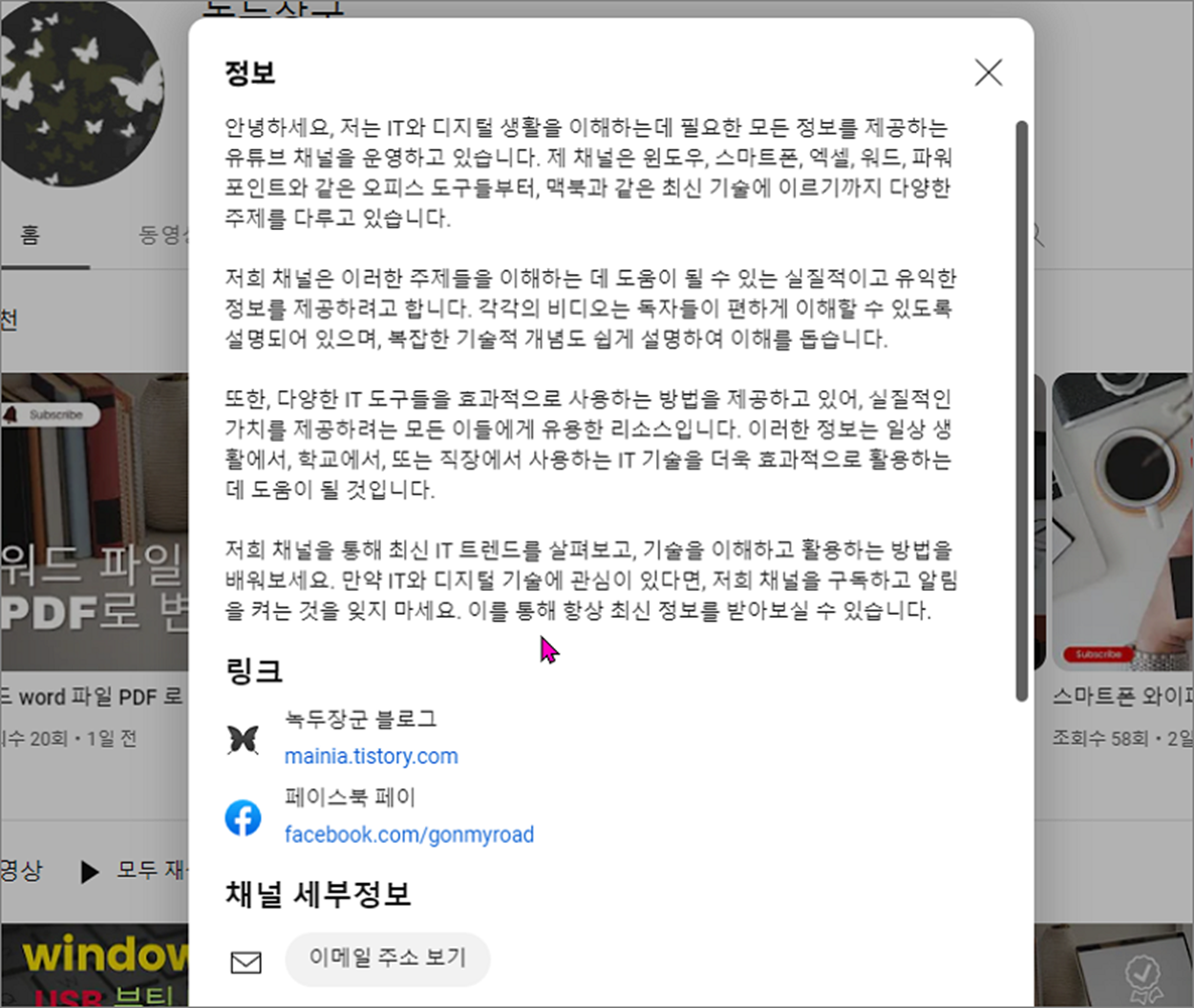 ▼ 먼저 자신의 채널 페이지로 가서 상단에 "채널 자세히 알아보기" 메뉴를 클릭합니다.