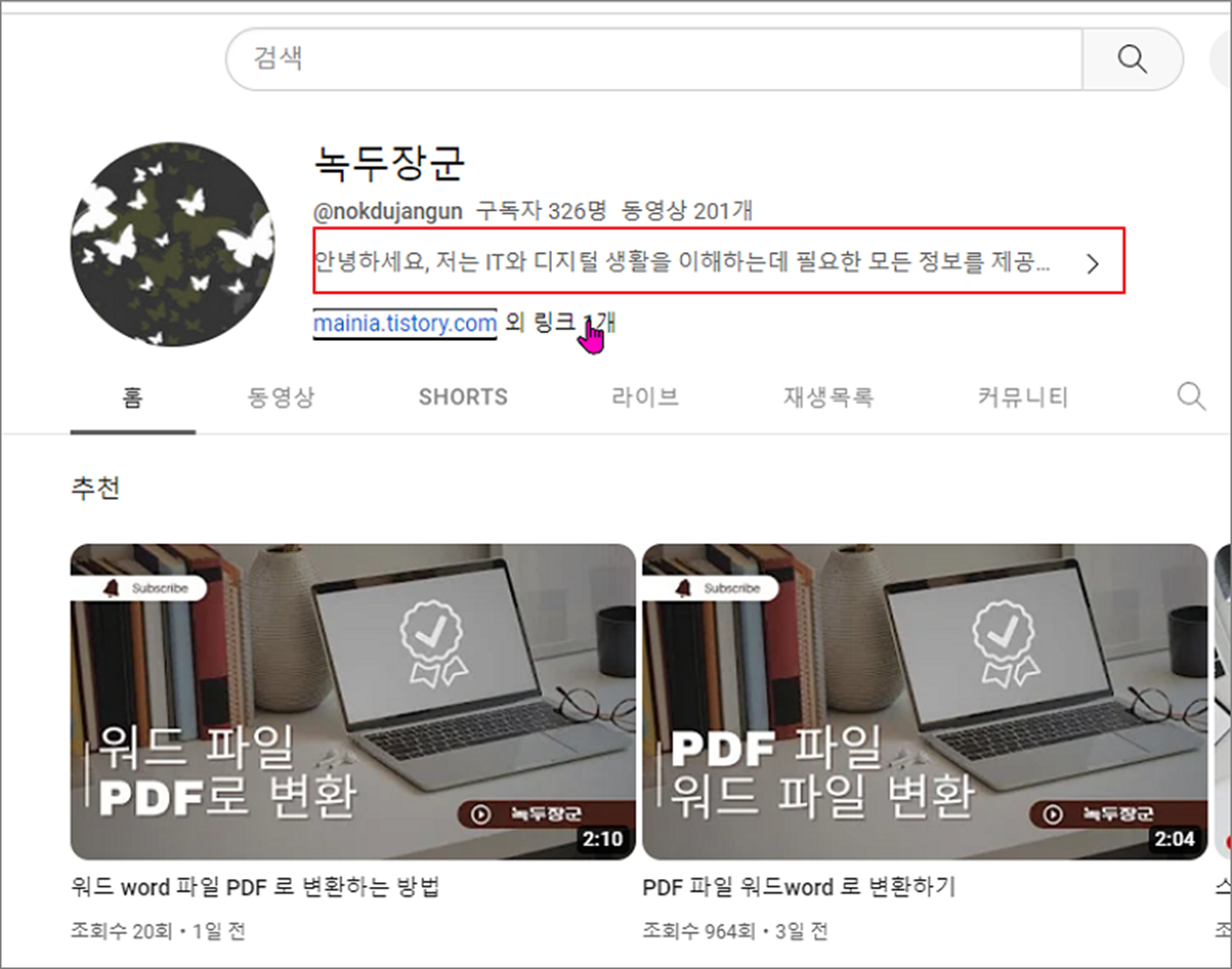 ▼ 화면 하단에 변경사항이 적용되었다는 메시지가 뜨면 완료가 된 것입니다. 다시 채널로 가서 확인해 보겠습니다. "채널 자세히 알아보기" 아래에 이전에 없던 링크가 걸려 있는 것을 확인할 수 있습니다. 또한 정보 란에 채널 설명도 확인했습니다. 이상으로 채널 정보를 꾸미는 방법을 알아보았습니다.