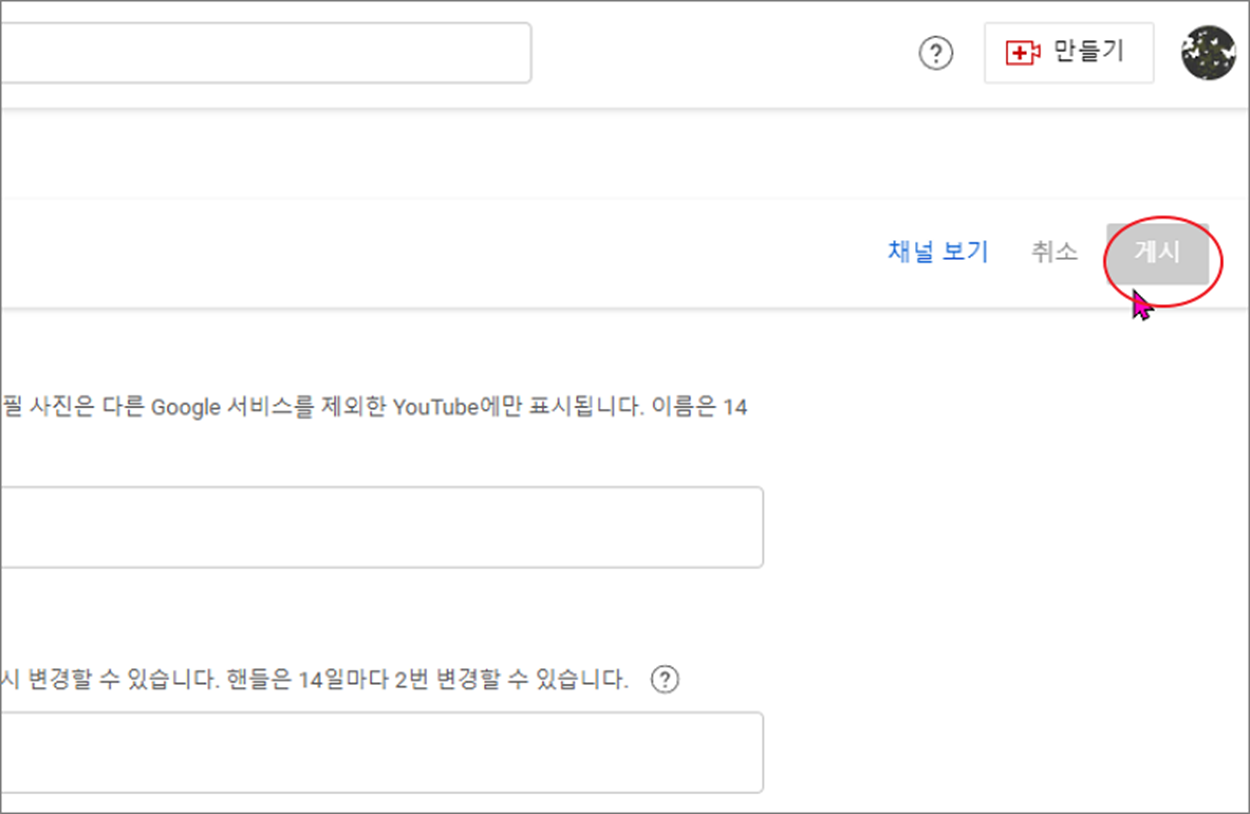 ▼ 정보 수정이 완료되었다면 오른쪽 상단에 “게시” 버튼을 눌러서 채널에 적용해야 됩니다.