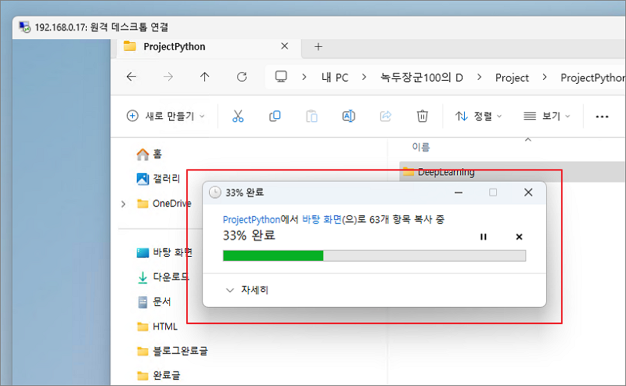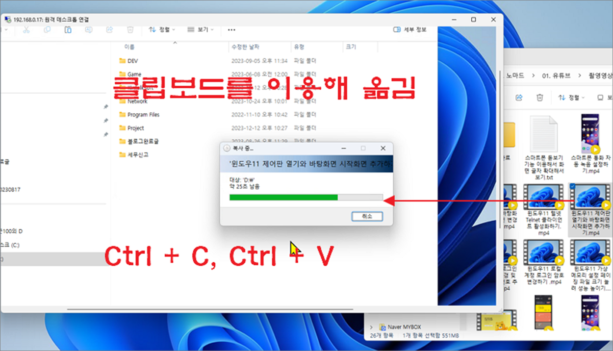 윈도우11 에서 다른 PC 의 윈도우를 원격으로 제어할 때 사용하는 것이 원격 데스크톱 입니다. 원격 데스크톱은 원격으로 PC 를 조작할 수 있을 뿐만 아니라 원격 PC 로 파일을 넘길 수도 있습니다. 파일을 전송하는 두가지 방법을 알아보겠습니다. 첫 번째 방법은 클립보드를 이용하는 것입니다. 두 번째는 클립보드가 안되는 경우나 대용량의 파일을 옮기고 싶을 때 주로 사용합니다.