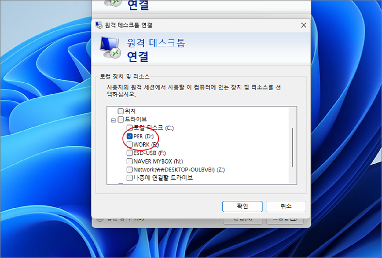 ▼ 해당 창에서는 원격 데스크톱과 사용자 컴퓨터간에 폴더 공유를 설정할 수 있습니다. 로컬 장치에서 공유하고 싶은 드라이브를 찾아 선택하고 "확인" 버튼을 눌러 창을 닫습니다.