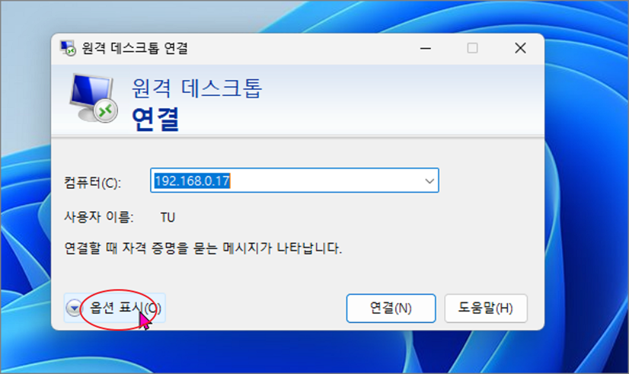 ▼ 원격 데스크톱 연결 창이 뜨면 연결할 PC 의 아이피를 넣고 연결을 누르면 되는데, 아래에 원격 PC 의 사용자 이름이 맞는지 확인합니다. 사용자 이름이 아니면 바로 아래 "옵션 표시"를 눌러 창을 확대합니다.