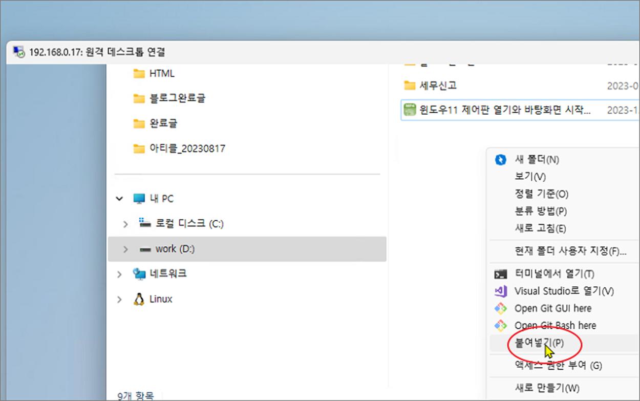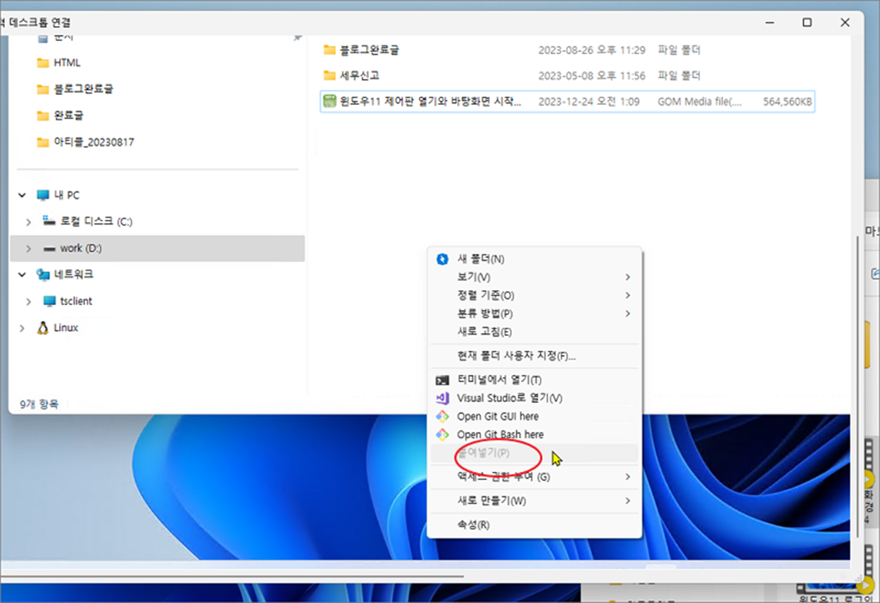 ▼ 파일을 복사하고 원격 PC 로 가서 오른쪽 마우스를 눌러보세요. 붙여 넣기가 활성화되어 있는 것을 확인할 수 있습니다. 이것으로 내 컴퓨터에서 원격지 컴퓨터로 클립보드를 이용해 파일을 옮겨 보았습니다.
