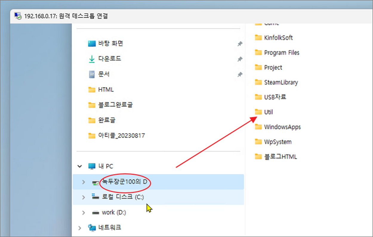 ▼ 해당 드라이브는 원격지 PC 의 드라이브가 아닌 내가 접속을 시도한 PC 의 드라이브입니다. 그래서 내 PC 와 같은 동일한 파일 목록이 보일 겁니다. 옮기고 싶은 파일이 있다면 복사해서 원격지 드라이브로 옮겨줍니다. 이런식으로 복사할 파일이 많은 경우 드라이브를 링크 옵션을 활용해 보시기 바랍니다.