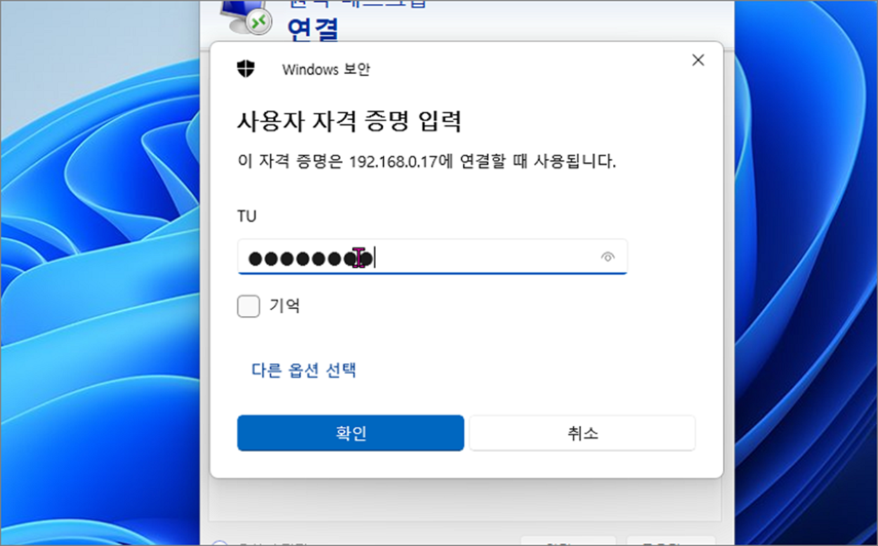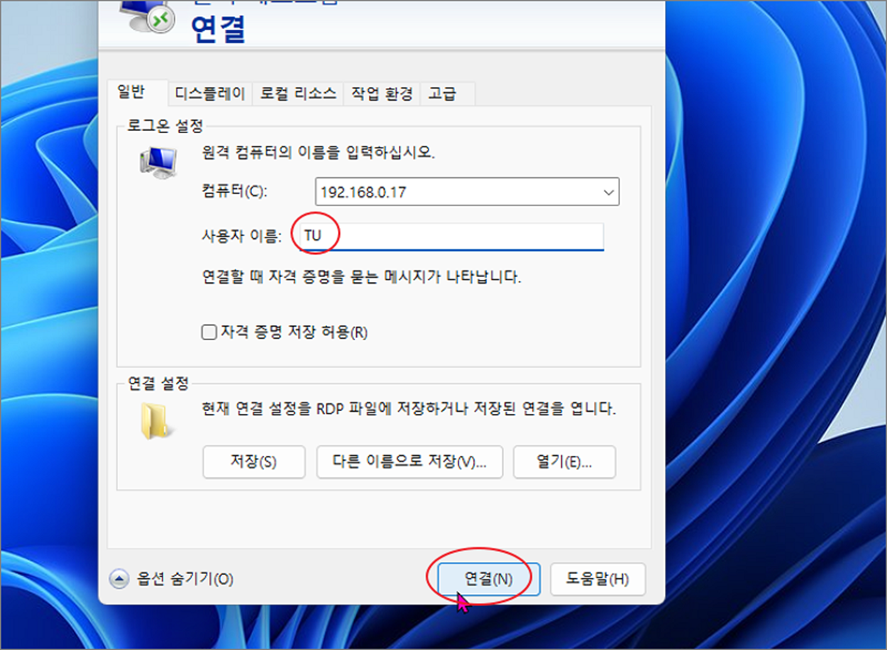 ▼ 일반 탭에서 "로그온 설정" 에 "사용자 이름" 을 변경하고 하단에 "연결" 버튼을 클릭합니다. 그리고 대상 PC 의 로그인 정보에 해당하는 패스워드를 정상적으로 입력해야 원격 제어를 위한 연결이 가능합니다.