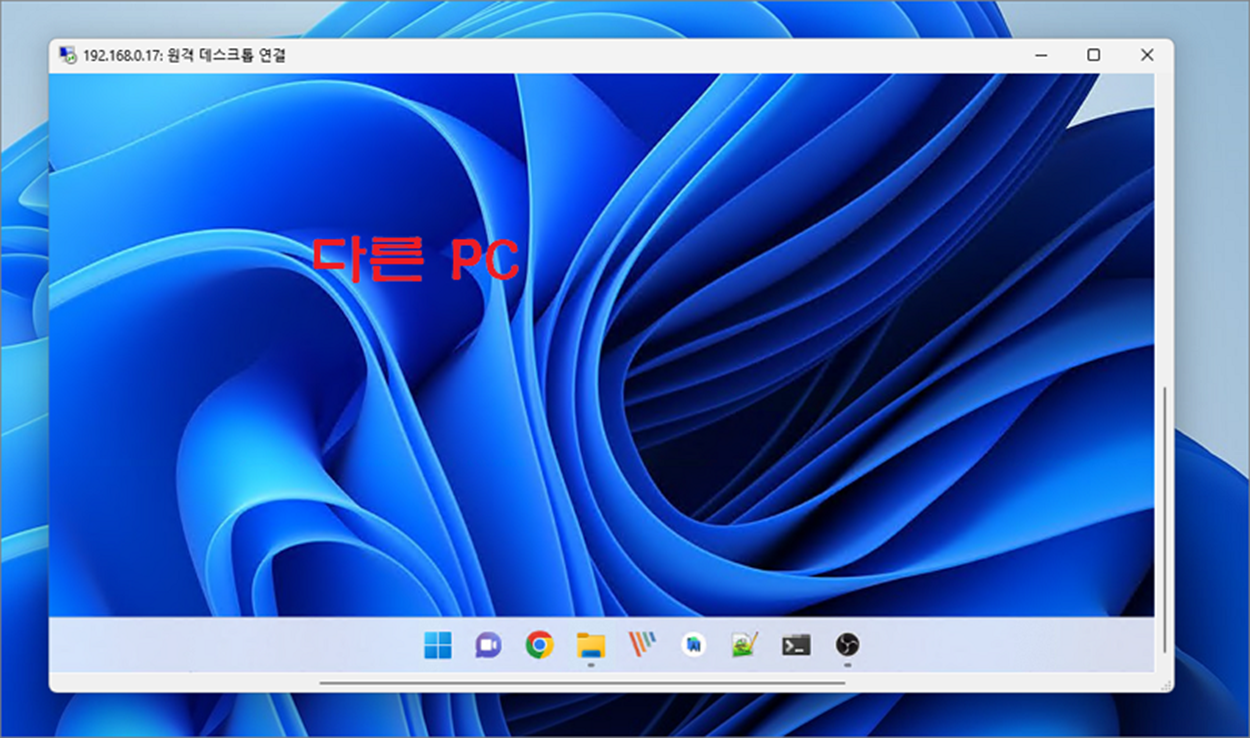 ▼ 다음 화면에는 원격으로 접속한 대상 PC 의 바탕화면이 나타납니다. 이제 원격 조정을 할수 있는 환경이 갖춰졌습니다.