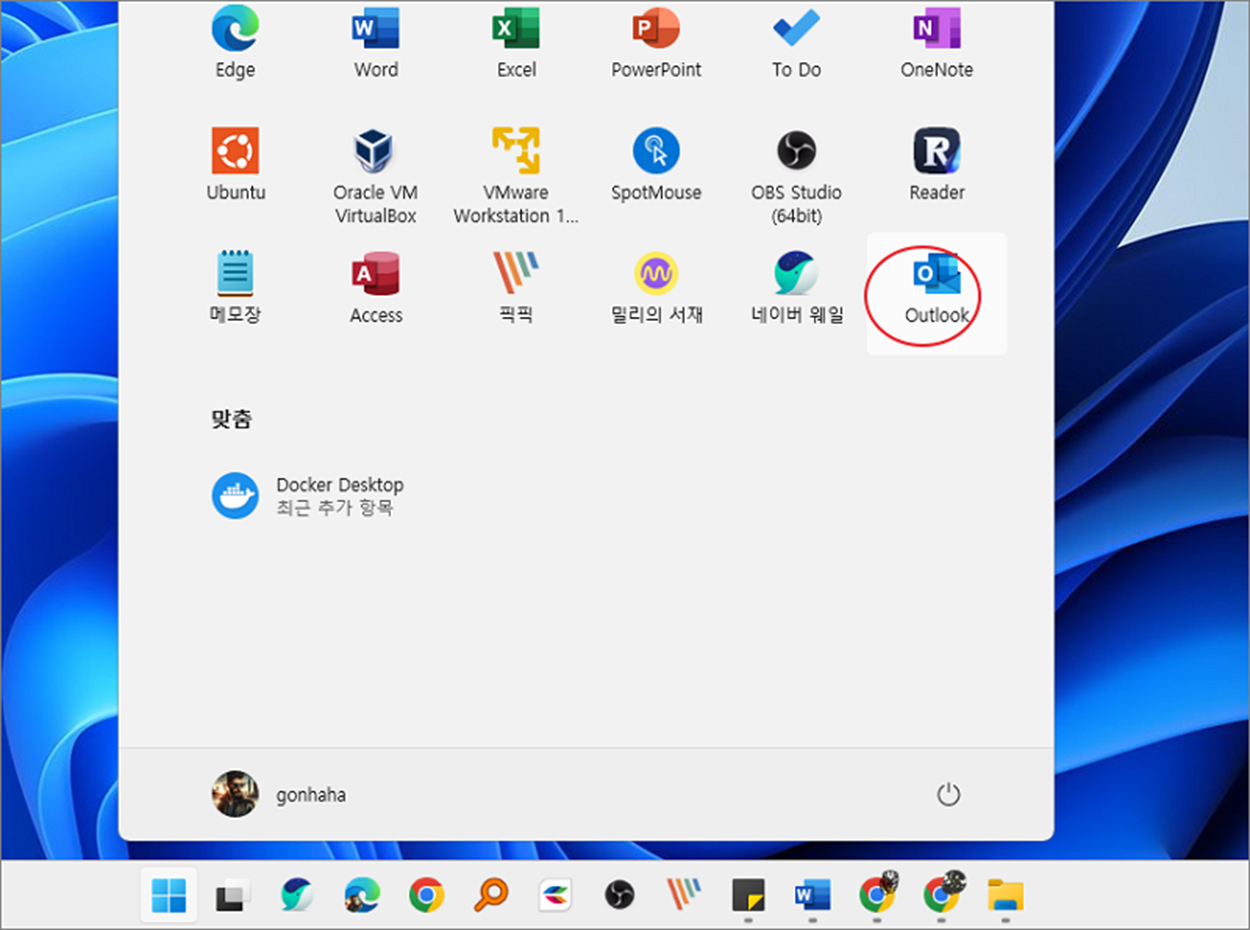 ▼ 실제로 시작 화면에 등록되었는지 확인해 보겠습니다. 뒤로 가기를 눌러서 시작 화면으로 가시면 방금 추가한 아웃룩 프로그램이 있을 겁니다.