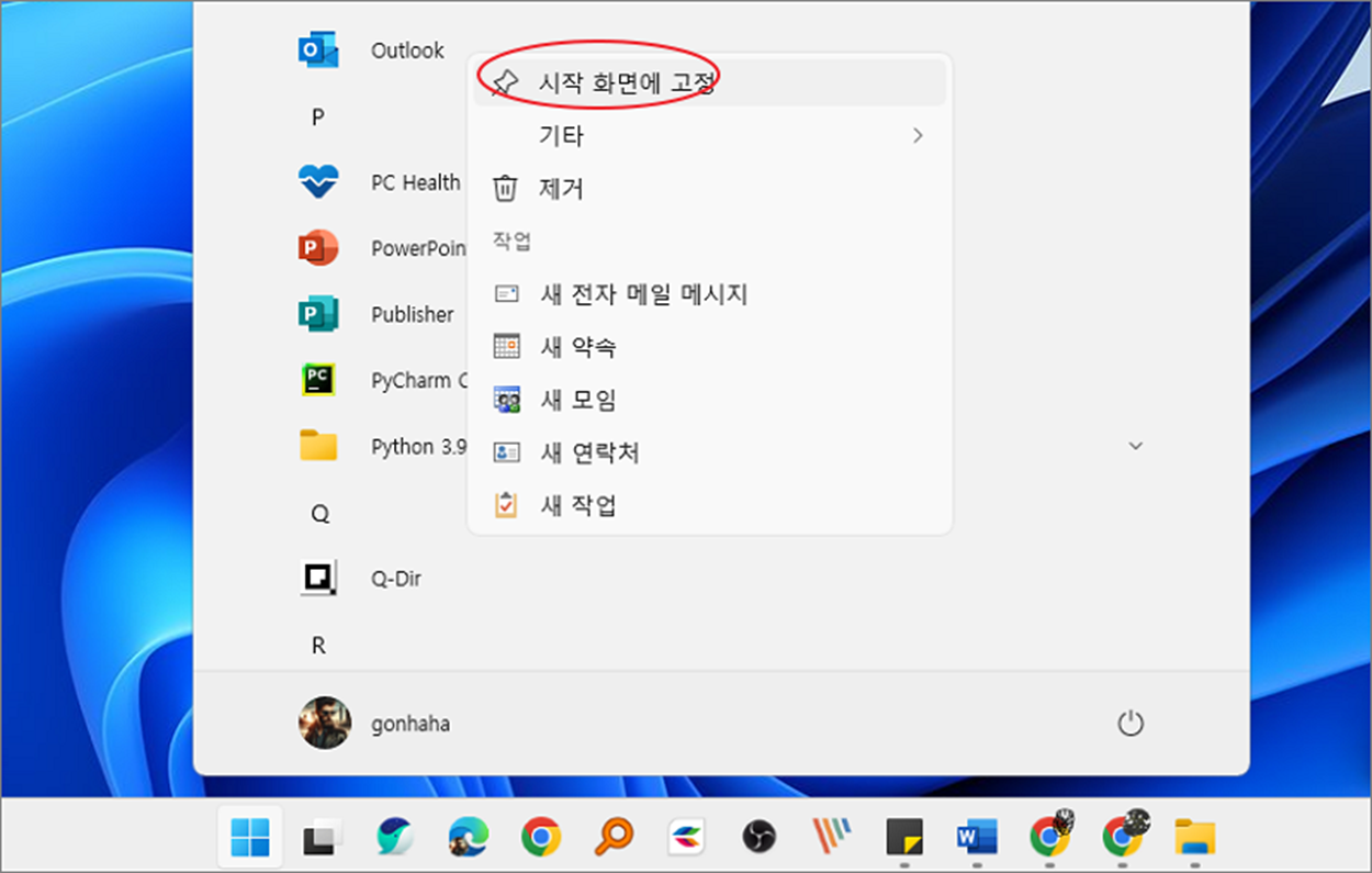 윈도우 11 에서 자주 사용하는 프로그램들은 빠르게 실행하기 위해서 작업표시줄이나 시작화면에 고정하고 사용합니다. 보통 작업 표시줄에 프로그램을 등록해서 많이 사용하는데, 등록한 프로그램이 많아 작업 표시줄 공간이 모자라는 경우 시작 화면에 고정해 놓고 빠르게 실행하는 용도로 사용합니다. 그럼 시작 화면을 클릭하면 나오는 상단 앱 목록에 특정 앱을 추가해 보도록 하겠습니다.