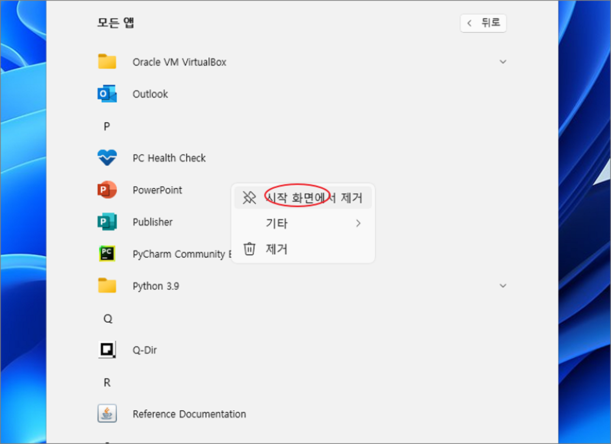 ▼ 앱 목록에서 파워포인트를 찾아서 오른쪽 마우스를 클릭합니다. 그런데 화면에는 "시작 화면에서 제거" 메뉴가 뜹니다. 이 메뉴는 이미 시작화면에 파워포인트 앱이 등록되었다는 의미입니다. 그럼 다른 앱을 등록해 보겠습니다.