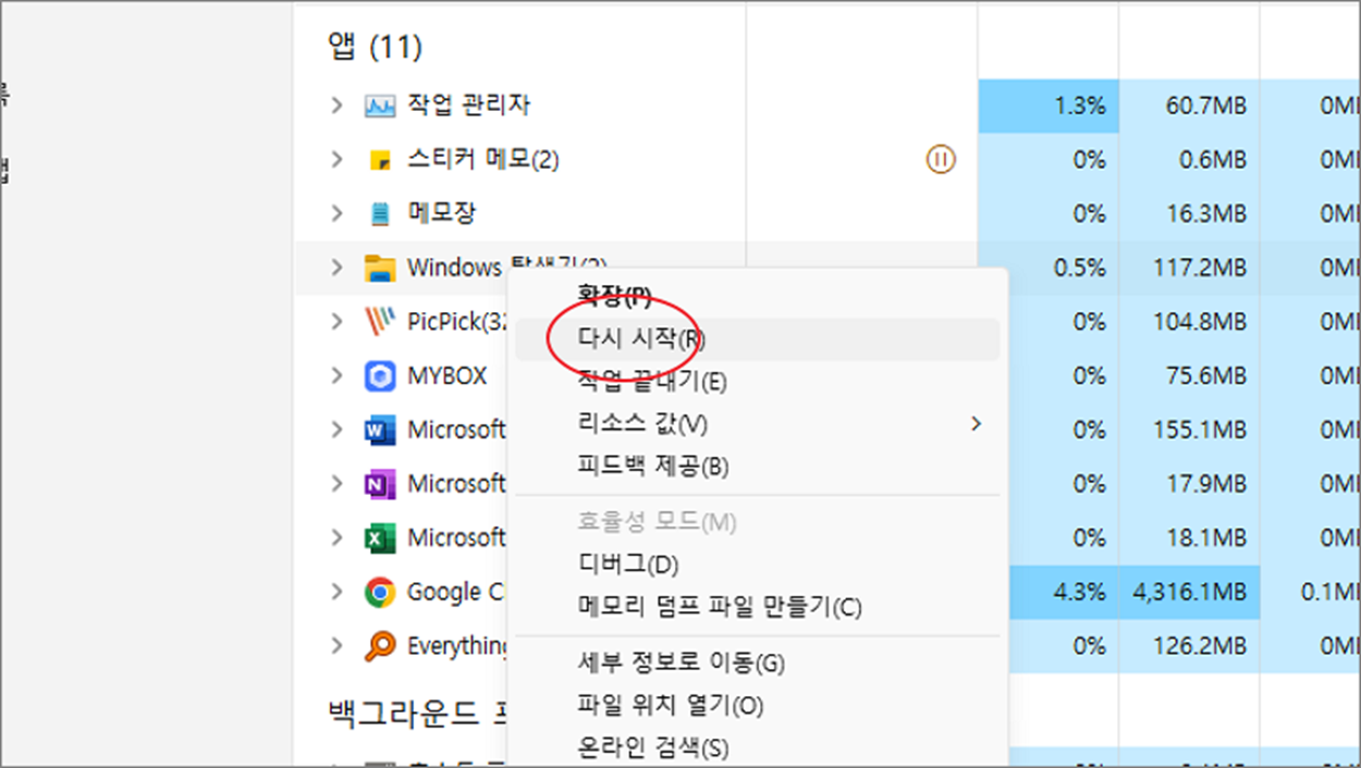 ▼ 파일 탐색기를 찾았다면 선택하고 오른쪽 마우스를 눌러서 "다시 시작" 메뉴를 선택합니다.