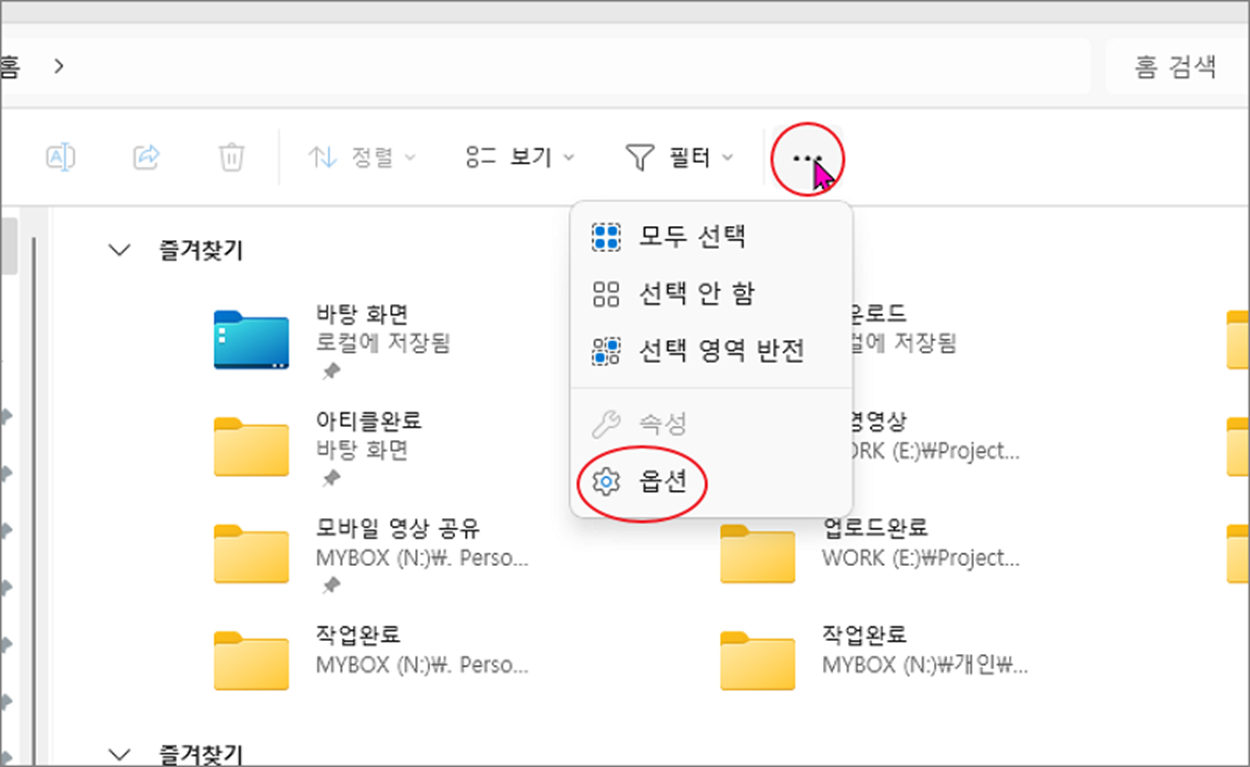 ▼ 첫번째는 느려진 파일 탐색기를 조치하기 위해 캐시를 삭제하는 방법입니다. 탐색기를 띄우고 상단 툴바에서 더보기 버튼을 누릅니다. 하위 메뉴에 옵션 클릭하면 "폴더 옵션" 창이 뜹니다.