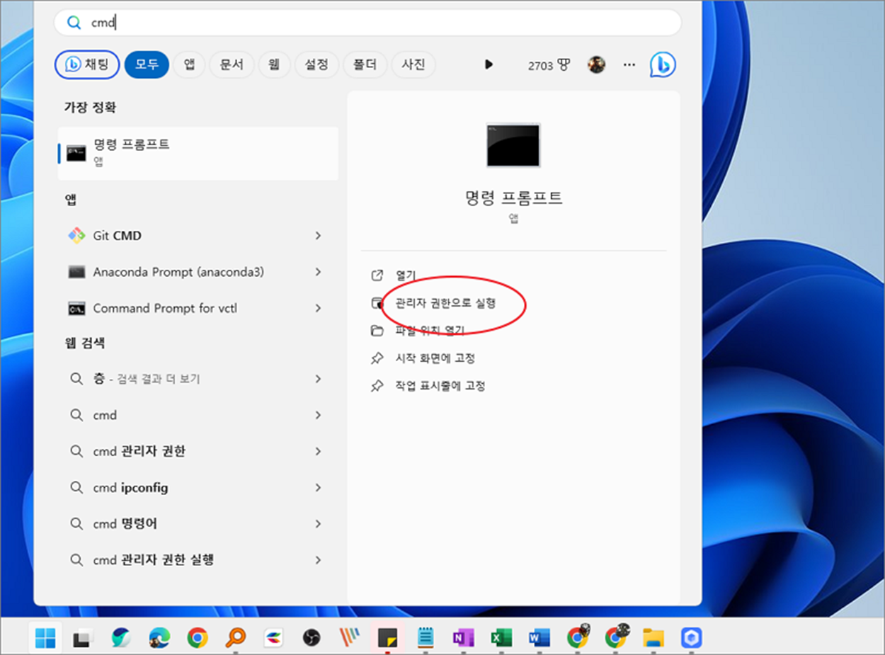 ▼ 세번째는 시스템에 파일 손상을 복구하는 유틸리티를 이용해 복구하는 방법입니다. 프로그램 실행을 위해서는 명령 프롬프트가 필요합니다. cmd 로 검색해서 명령 프롬프트를 찾은 다음 관리자 권한으로 띄웁니다.