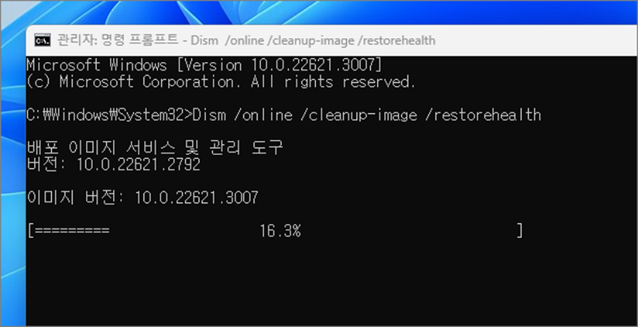 ▼ 관리자 권한이 뜨면 다음과 같이 입력합니다. 명령어를 입력하고 실행하면 다소 시간이 걸릴 겁니다. 시스템 파일을 검사하는 과정이 나옵니다. 퍼센트가 100이 되고 복원 작업이 완료되었다는 메시지가 뜰 때가지 기다립니다.