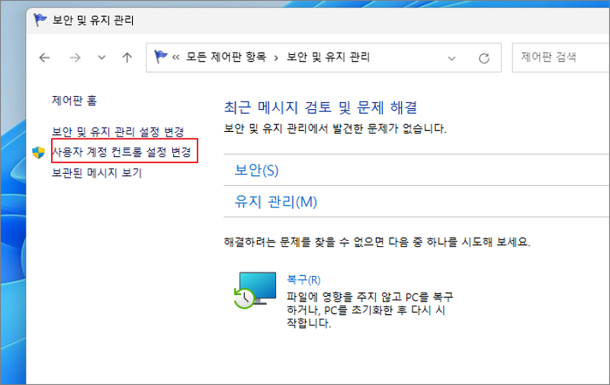 ▼ 두 번째는 제어판에서 "사용자 계정 컨트롤" 을 변경하는 방법입니다.