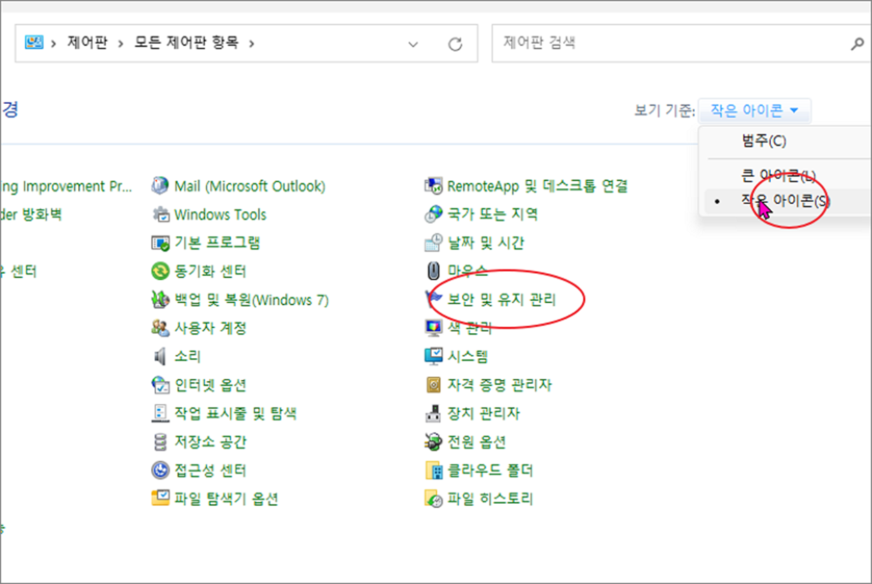 ▼ 검색에서 제어판을 실행하고 보기 기준을 "작은 아이콘" 으로 변경합니다. 그리고 "보안 및 유지관리" 메뉴를 클릭합니다.