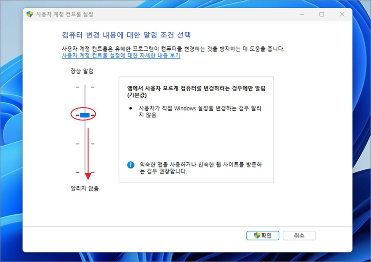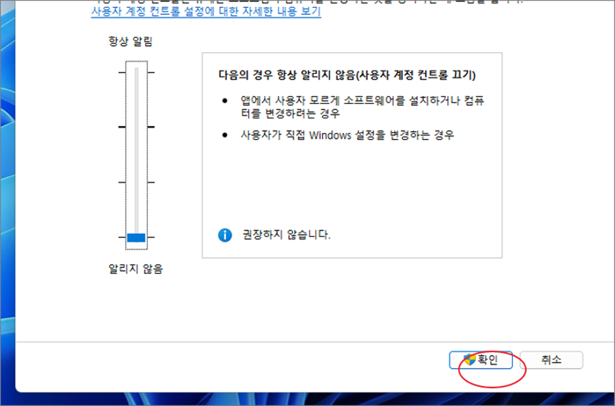 ▼ 메뉴를 클릭하면 이전 설정 화면과 동일한 창이 나타납니다. 여기서도 알리지 않음으로 내리고 확인 버튼을 눌러서 설정을 종료합니다. 이상으로 사용자 계정 컨트롤 팝업창 이 뜨지 않도록 설정을 변경하는 두 가지 방법에 대해 알아보았습니다.