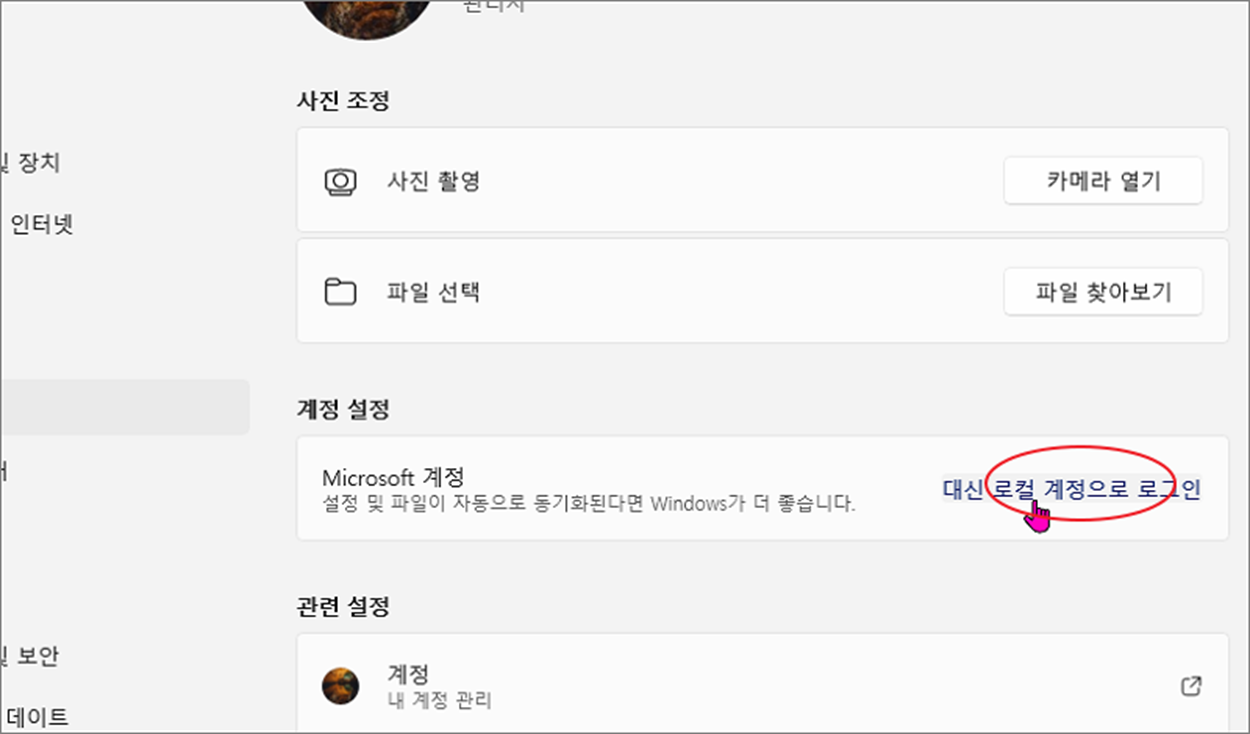 ▼ 여기에서 "계정 설정" 에 "대신 로컬 계정으로 로그인" 링크를 클릭해서 로컬 계정 전환을 진행합니다.
