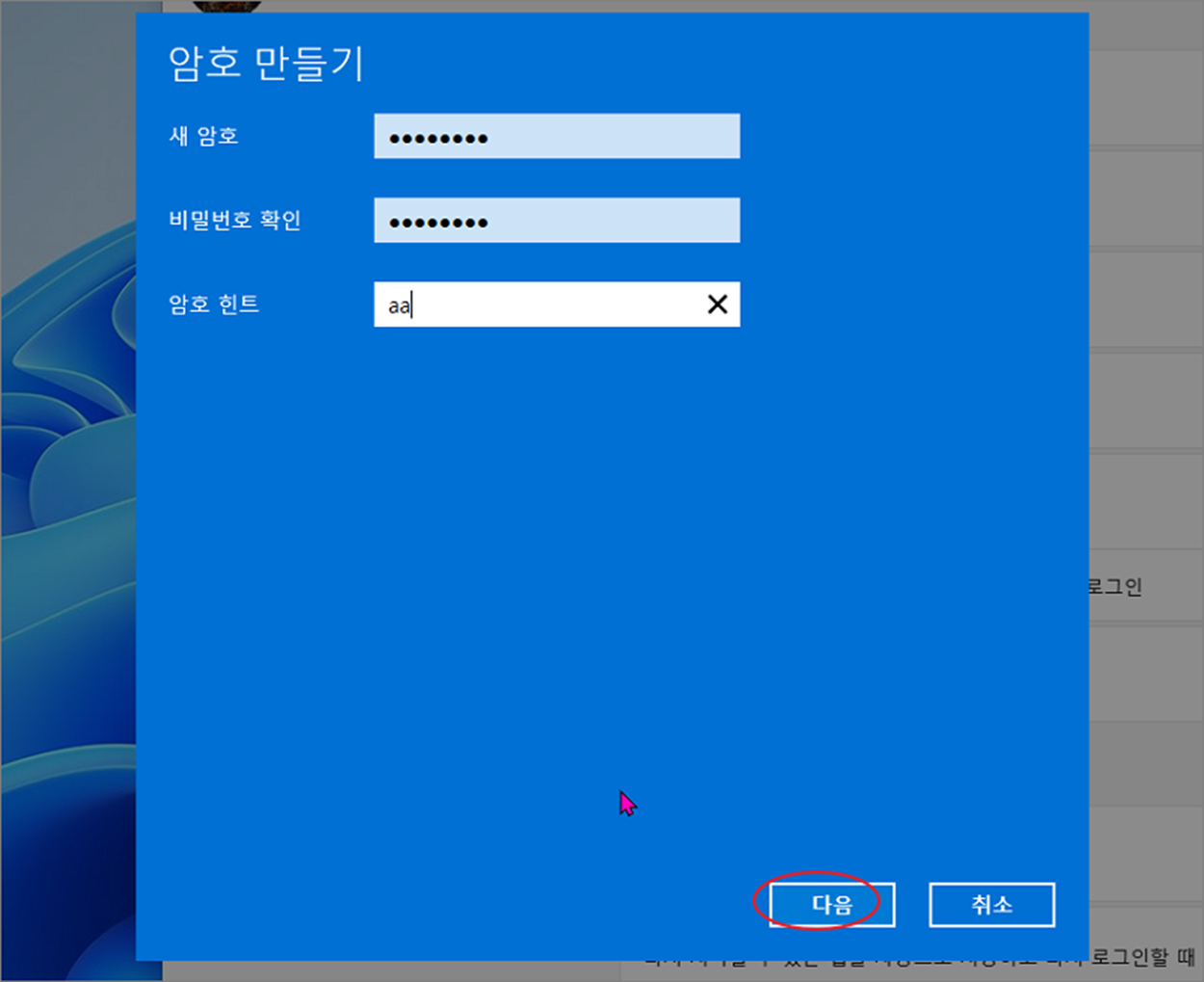 ▼ 팝업 창에서 새 암호와 비밀번화 확인 및 암호 힌트를 입력하고 다음으로 넘어갑니다. 마침을 눌러 암호 설정 창을 닫으면 앞으로 윈도우를 접속할 때 암호를 입력해야 합니다. 여기에서 다시 암호를 입력하고 싶지 않다면 "변경" 버튼을 눌러서 현재 암호를 입력하고 다음으로 넘어갑니다. 그리고 새 암호 입력란에서는 모두 비우고 완료합니다. 그럼 앞으로 암호없이 로그인 할수 있는 상태가 되는 것입니다. 이상으로 암호없이 윈도우를 접속하는 방법을 알아보았습니다.