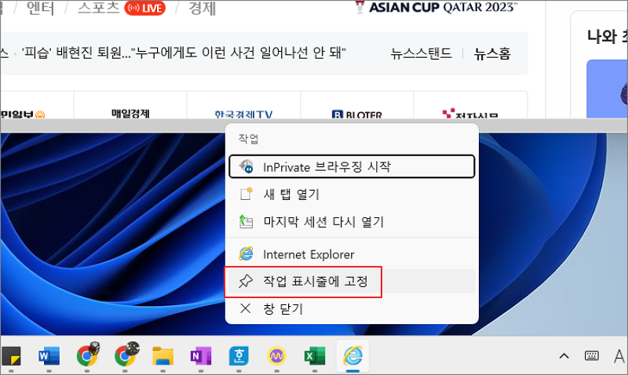 ▼ 그런데 작업 표시줄에 표시되어 있는 익스플로러 아이콘을 "작업 표시줄에 고정" 메뉴를 이용해서 추가한 후 클릭해도 일반적인 브라우저처럼 뜨지는 않습니다.