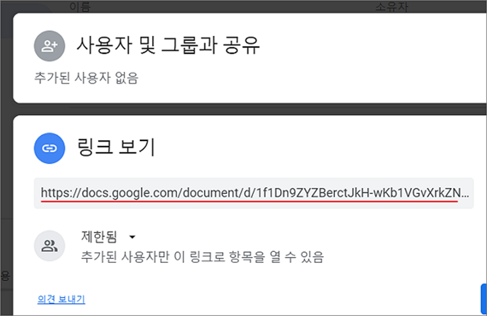 ▼ “사용자 및 그룹과 공유” 팝업창이 뜨면서 링크 주소를 알려 줍니다. 해당 문서는 사용자 추가가 필요하지 않습니다. 자신의 문서이기 때문에 URL 만 복사해서 링크하면 연결이 됩니다.