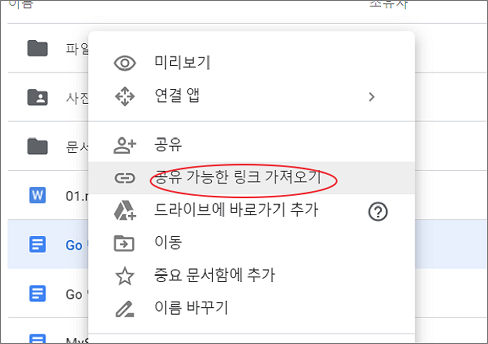 ▼ 구글 드라이브에서 링크할 문서를 찾은 다음 오른쪽 마우스를 클릭하고 “공유 가능한 링크 가져오기” 메뉴를 선택합니다.