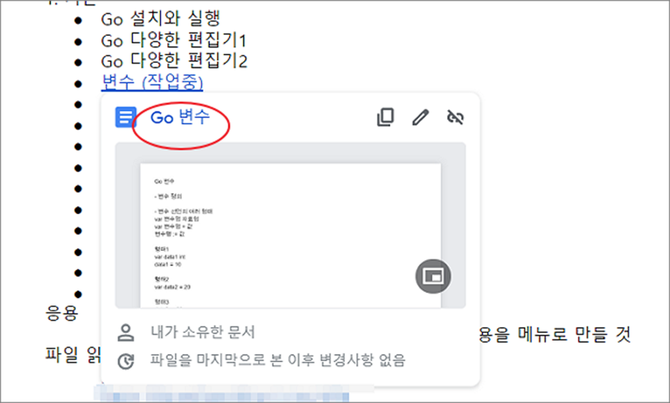 ▼ 하이퍼링크 연결한 텍스트에 마우스를 가져가 보세요. 그림처럼 링크한 문서의 섬네일 화면이 뜰 겁니다. 이것으로 구글 문서도구에서 특정 문서를 하이퍼링크로 연결하는 방법에 대해 알아보았습니다.