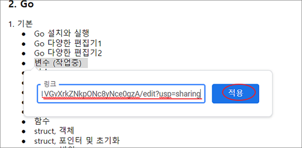 ▼ 링크 팝업창에 연결할 문서의 주소를 입력합니다. 클립보드에 저장되어 있으니 Ctrl + V 를 누르면 될 겁니다. 그리고 “적용” 버튼을 클릭합니다.