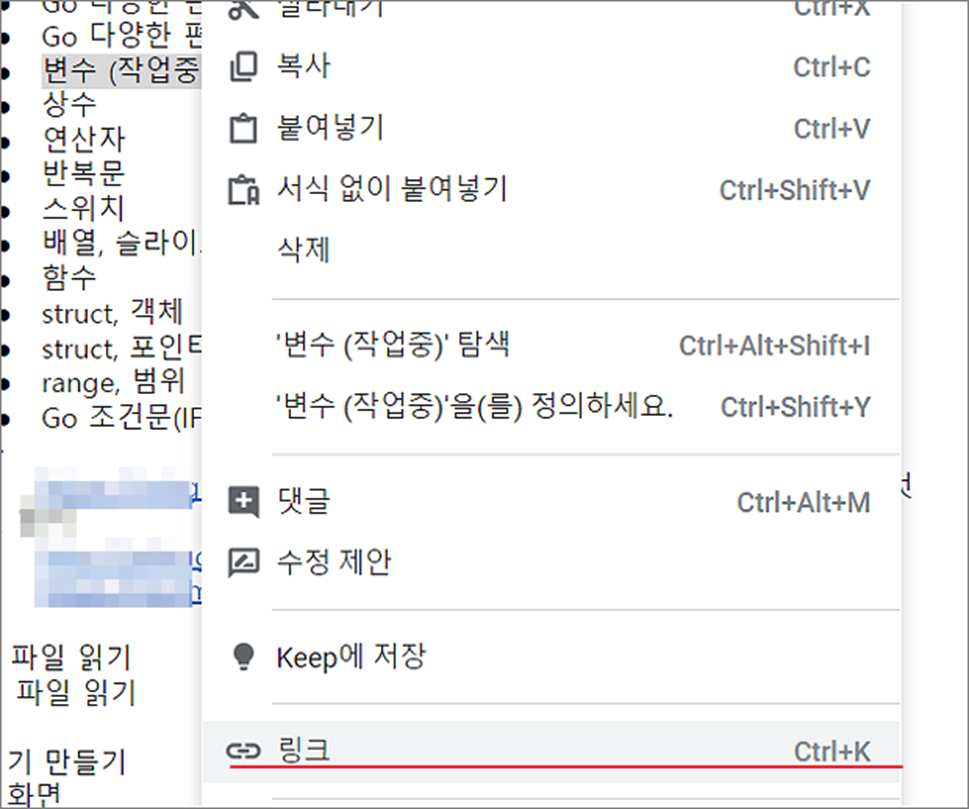 ▼ 다음은 편집하고 있는 문서로 갑니다. 문서에서 링크할 텍스트를 선택하고 오른쪽 마우스 > 링크 메뉴를 선택합니다.