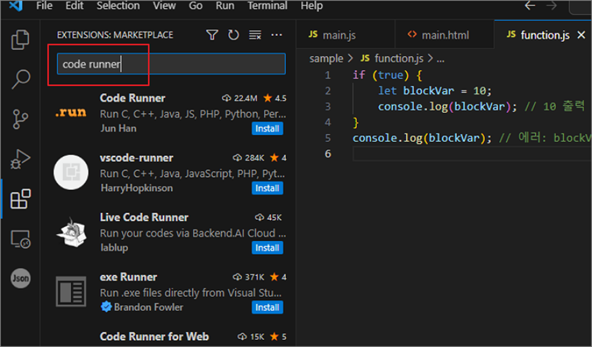 ▼ “Code Runner” 확장 프로그램을 찾았다면 찾았다면 install 버튼을 눌러서 설치를 진행합니다.
