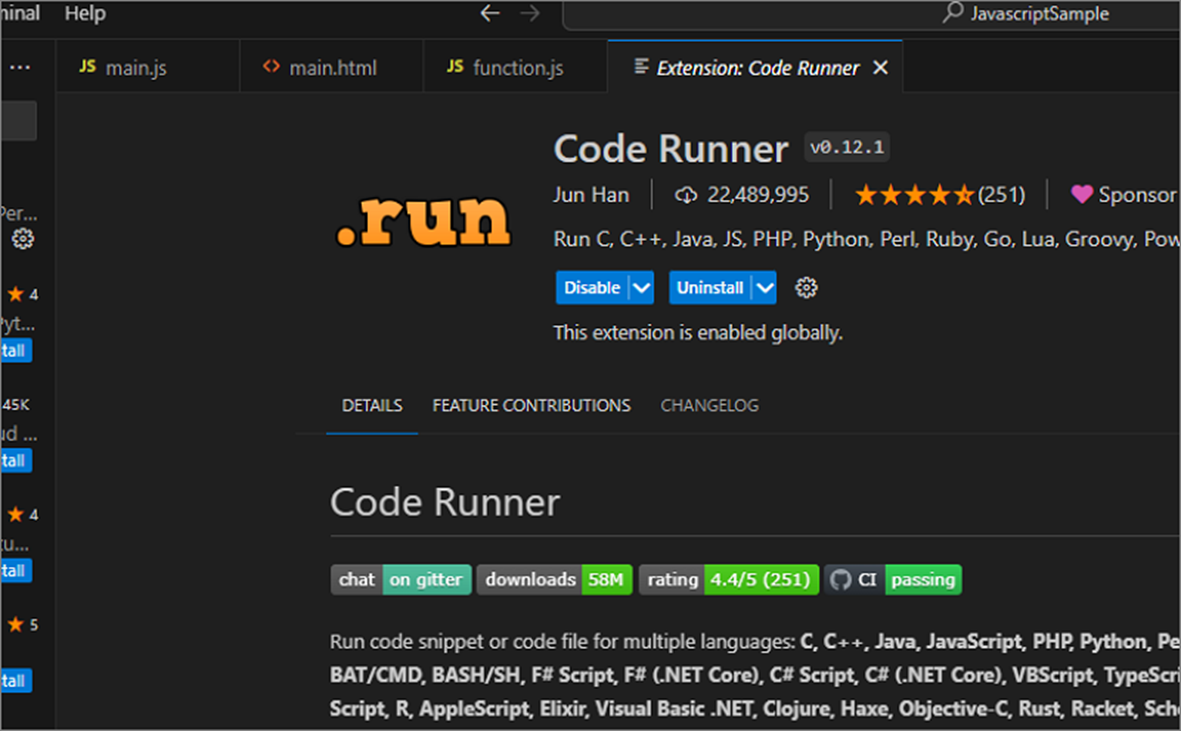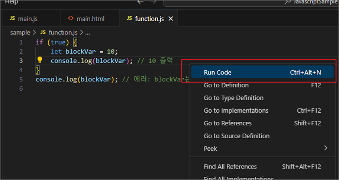 ▼ 설치가 끝나고 샘플로 만든 자바스크립트 소스가 들어 있는 파일을 엽니다. 그리고 오른쪽 마우스를 눌러 Run Code 를 실행합니다.