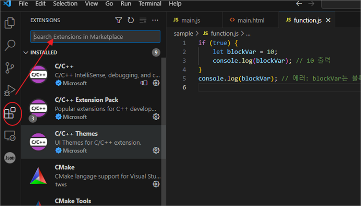 ▼ Visual Studio Code 자바스크립트 실행을 위해서는 확장 프로그램이 필요합니다. 확장 프로그램 설치를 위해 왼쪽 사이드에 “확장” 메뉴를 클릭합니다.