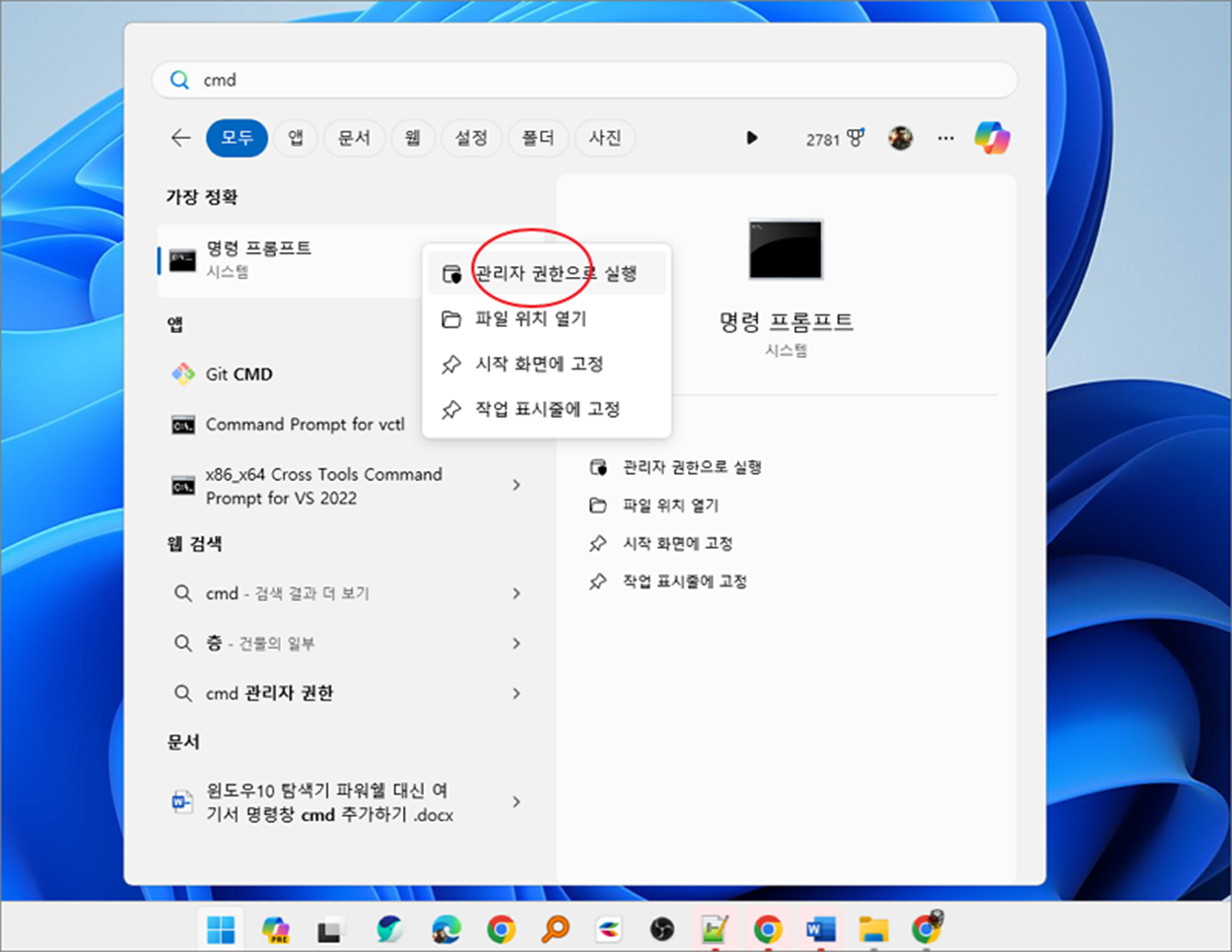 ▼ 삭제를 하기 위해서 명령 프롬프트 창을 띄웁니다. 검색에서 명령 프롬프트를 찾고 오른쪽 마우스를 눌러 “관리자 권한으로 실행” 을 선택합니다.