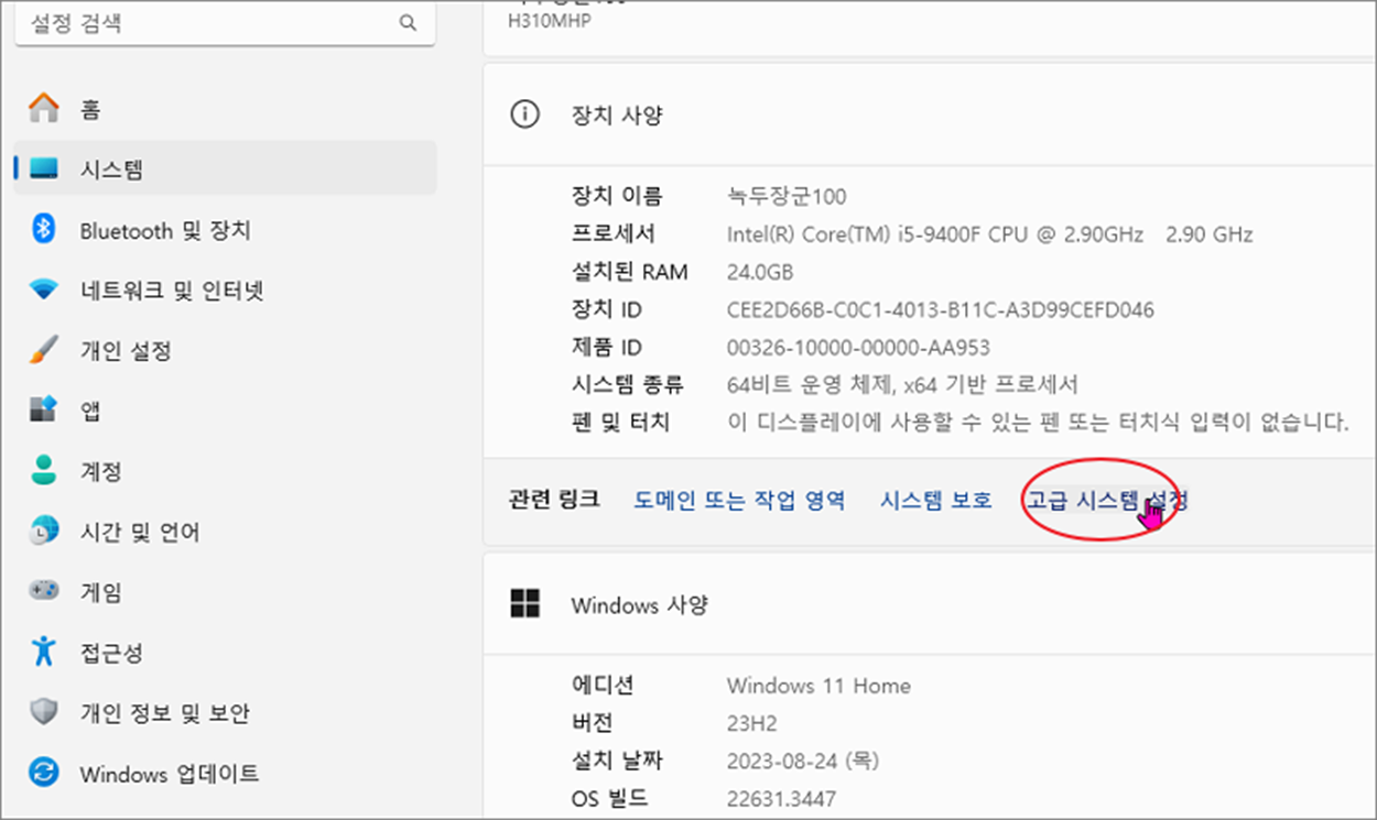 ▼ 속성 화면이 나타나면 관련 링크에 “고급 시스템 설정” 메뉴를 클릭합니다.