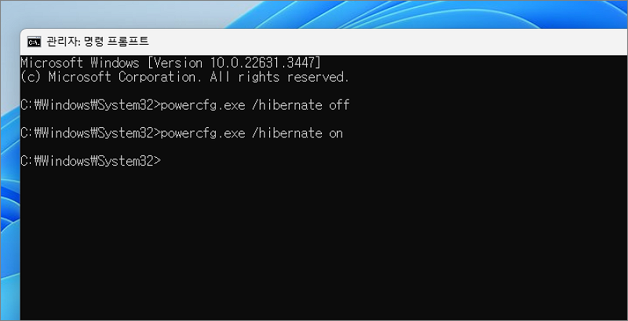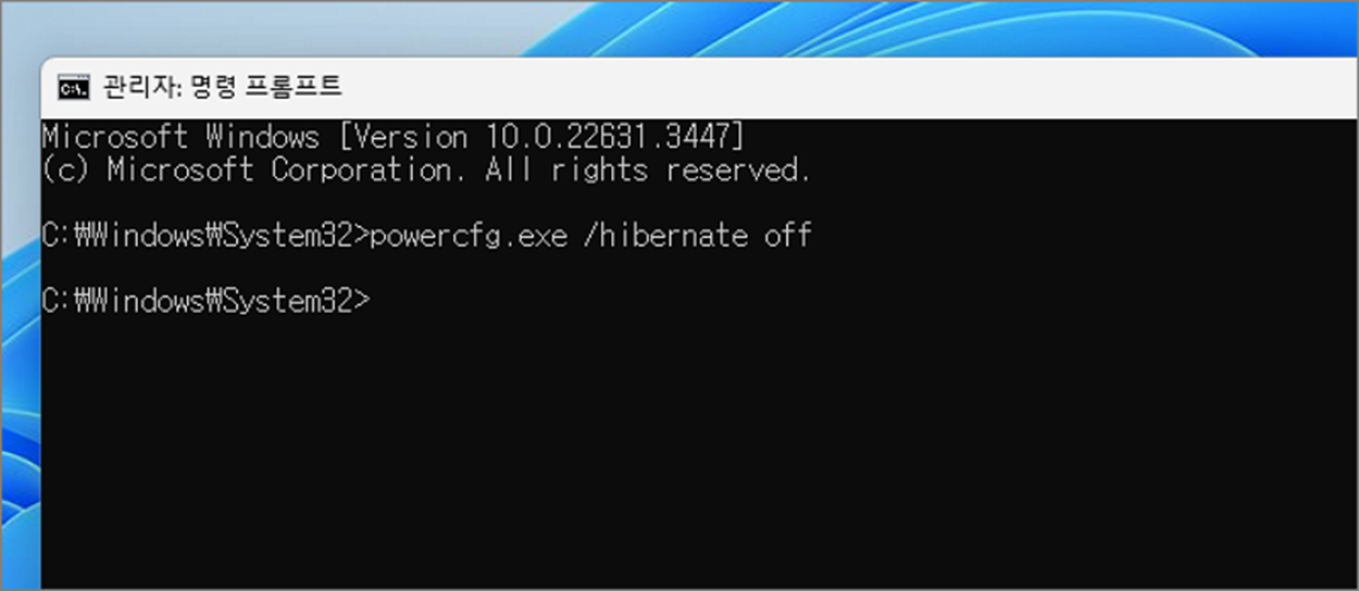 ▼ Hibernate 모드를 끄기 위해 다음 명령어를 입력합니다. Hibernate 매개변수로 off 을 넘깁니다.