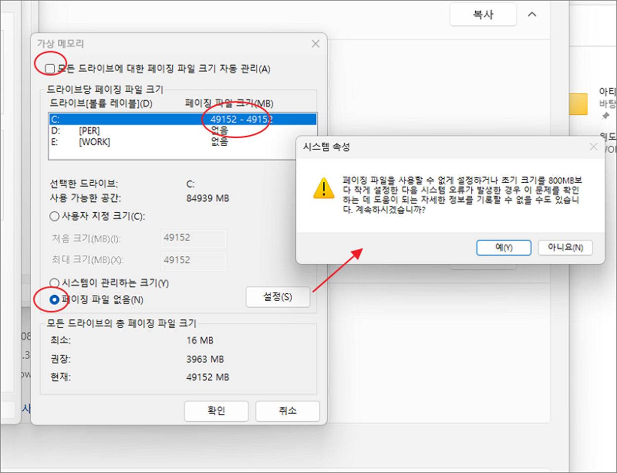 ▼ “가상 메모리” 변경 창이 뜨면 각 드라이브 마다 페이징 할당 크기가 있는 곳을 찾아 선택합니다. 그리고 아래로 내려가서 “페이징 파일 없음” 을 선택하고 “설정” 버튼을 클릭합니다. 경고 메시지가 떠도 무시하고 “예” 를 눌러 창을 닫습니다.