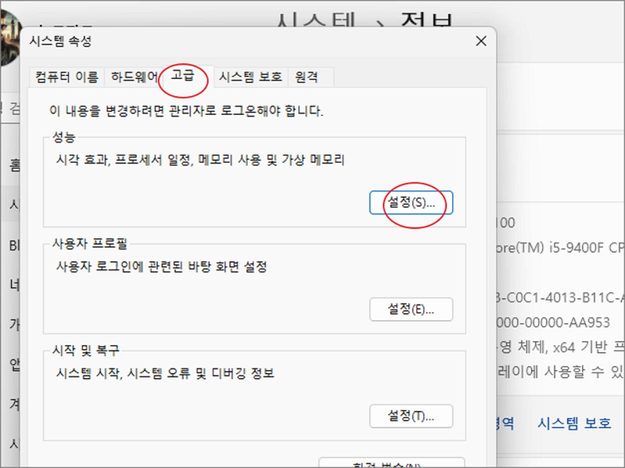 ▼ 시스템 속성 창이 뜨면 “고급” 탭으로 이동하고 “성능” 에 있는 “설정” 버튼을 클릭합니다.