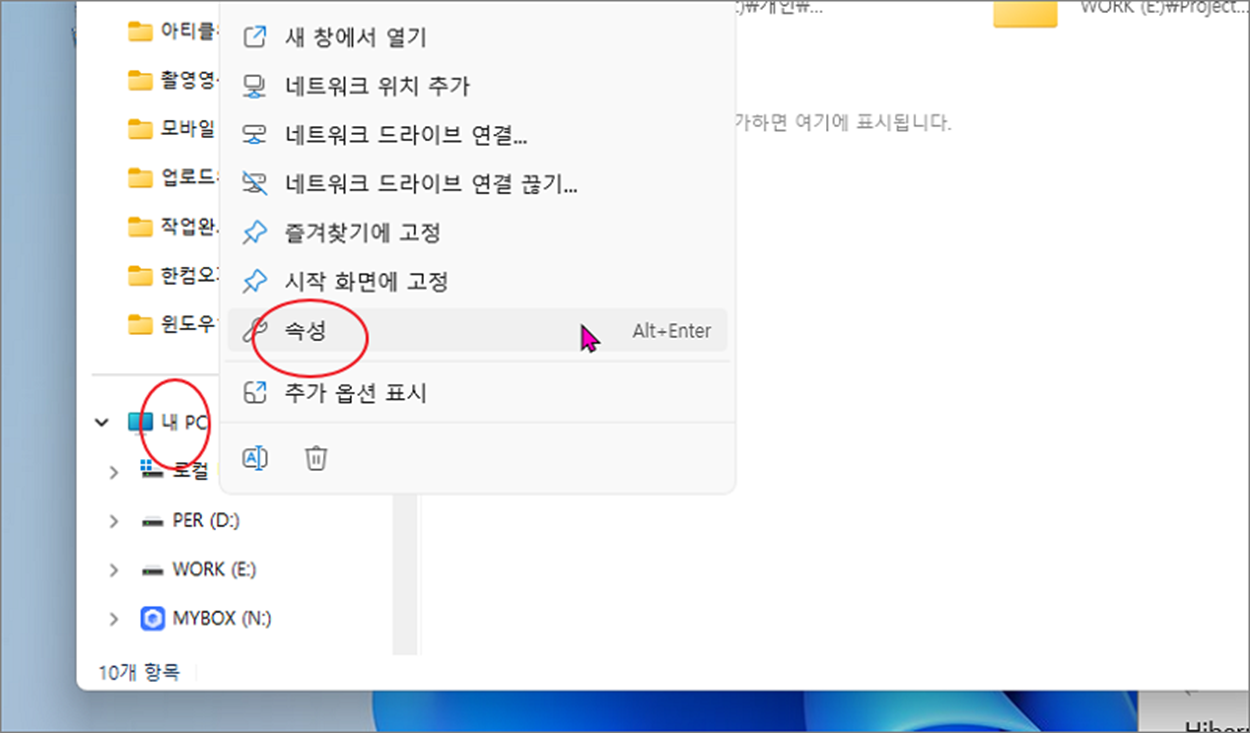 ▼ 가상메모리 관리 파일을 삭제하기 위해 탐색기를 띄웁니다. 그리고 “내 PC” 의 속성 창을 띄웁니다.