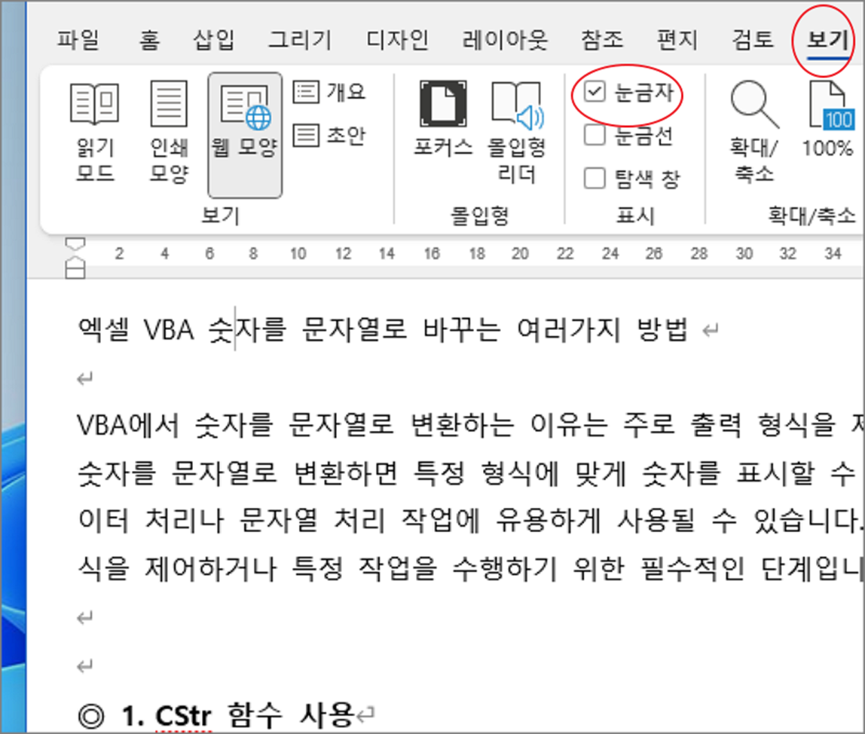 ▼ 눈금자를 표시하고 싶다면 “보기” 탭 > 표시 항목 > 눈금자 옵션을 체크합니다.